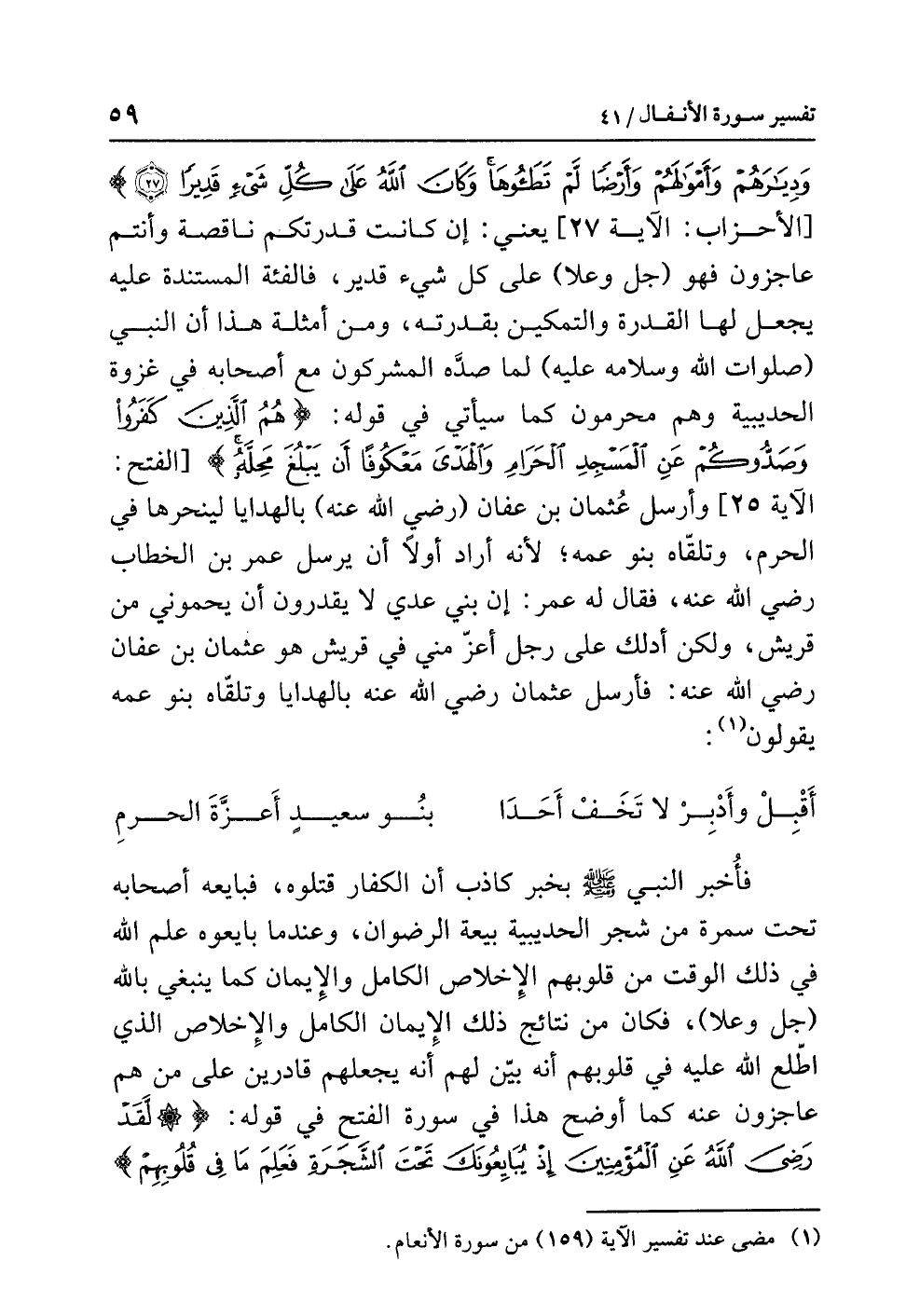 وَدِيَارَهُمْ وَأَمْوَالَهُمْ وَأَرْضاً لَّمْ تَطَؤُوهَا وَكَانَ اللَّهُ عَلَى كُلِّ شَيْءٍ قَدِيراً (27)} [الأحزاب: الآية 27] يعني: إن كانت قدرتكم ناقصة وأنتم عاجزون فهو (جل وعلا) على كل شيء قدير، فالفئة المستندة عليه يجعل لها القدرة والتمكين بقدرته، ومن أمثلة هذا أن النبي (صلوات الله وسلامه عليه) لما صدَّه المشركون مع أصحابه في غزوة الحديبية وهم محرمون كما سيأتي في قوله: {همُ الَّذِينَ كَفَرُوا وَصَدُّوكُمْ عَنِ الْمَسْجِدِ الْحَرَامِ وَالْهَدْيَ مَعْكُوفاً أَن يَبْلُغَ مَحِلَّهُ} [الفتح: الآية 25] وأرسل عُثمان بن عفان (رضي الله عنه) بالهدايا لينحرها في الحرم، وتلقّاه بنو عمه؛ لأنه أراد أولاً أن يرسل عمر بن الخطاب رضي الله عنه، فقال له عمر: إن بني عدي لا يقدرون أن يحموني من قريش، ولكن أدلك على رجل أعزّ مني في قريش هو عثمان بن عفان رضي الله عنه: فأرسل عثمان رضي الله عنه بالهدايا وتلقّاه بنو عمه يقولون (¬1):