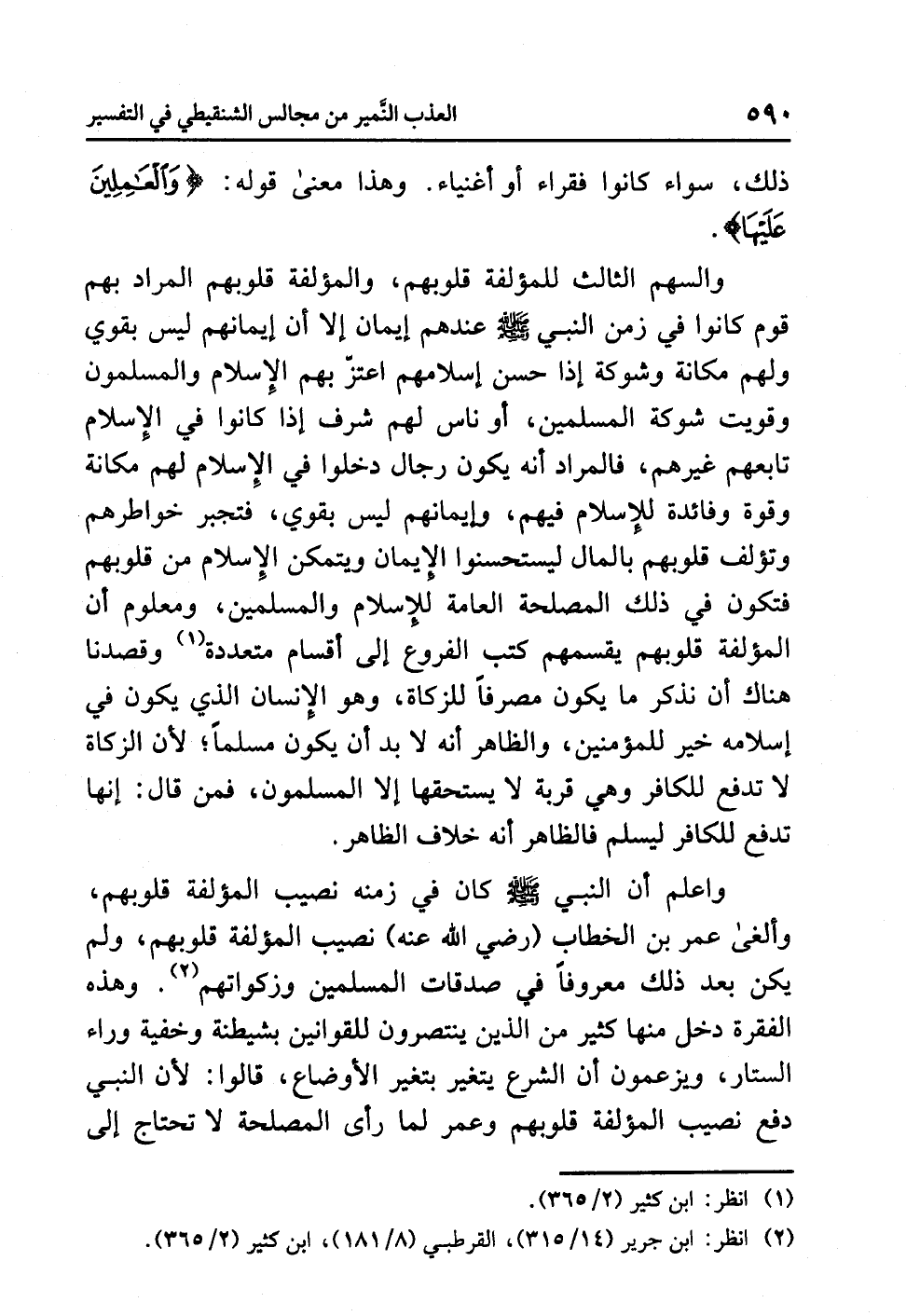 وَاعْلَمْ أن النبيَّ صلى الله عليه وسلم كان في زمنِه نصيبُ المؤلفةِ قلوبُهم، وَأَلْغَى عمرُ بنُ الخطابِ (رضي الله عنه) نصيبَ المؤلفةِ قلوبُهم، وَلَمْ يكن بعدَ ذلك مَعْرُوفًا فِي صدقاتِ المسلمينَ وزكواتِهم (¬3). وهذه الفقرةُ دَخَلَ منها كثيرٌ من الذينَ ينتصرونَ للقوانينِ بِشَيْطَنَةٍ وخفيةٍ وراءَ الستارِ، ويزعمونَ أن الشرعَ يتغيرُ بتغيرِ الأوضاعِ، قالوا: لأَنَّ النبيَّ دَفَعَ نصيبَ المؤلفةِ قلوبُهم وعمرُ لَمَّا رَأَى المصلحةَ لاَ تحتاجُ إلى