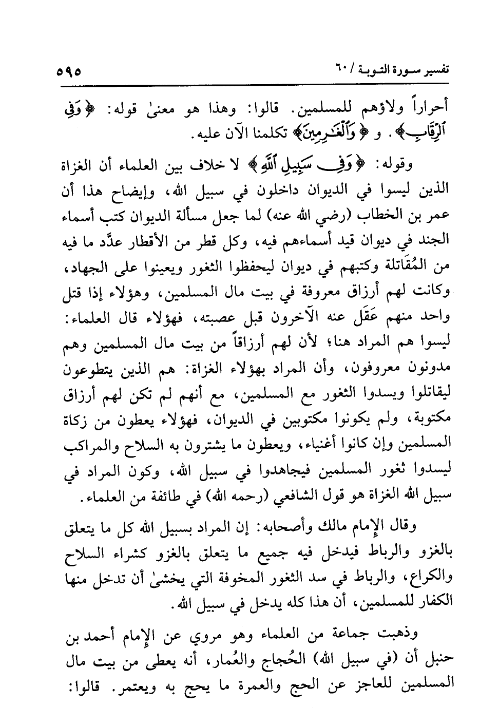وقولُه: {وَفِي سَبِيلِ اللَّهِ} لاَ خلافَ بَيْنَ العلماءِ أن الغزاةَ الذين ليسوا في الديوانِ داخلينَ في سبيلِ اللَّهِ، وإيضاحُ هذا أن عمرَ بنَ الخطابِ (رضي الله عنه) لَمَّا جَعَلَ مسألةَ الديوانِ كَتَبَ أسماءَ الجندِ في ديوانٍ قَيَّدَ أسماءَهم فيه، وَكُلُّ قُطْرٍ من الأقطارِ عَدَّدَ ما فيه من المُقَاتِلَةِ وَكَتَبَهُمْ في ديوانٍ ليحفظوا الثغورَ وَيُعِينُوا على الجهادِ، وكانت لهم أرزاقٌ معروفةٌ في بيتِ مالِ المسلمينَ، وهؤلاء إذا قُتِلَ واحدٌ منهم عَقَلَ عنه الآخَرُونَ قبلَ عصبتِه، فهؤلاء قال العلماءُ: ليسوا هم المرادَ هنا؛ لأن لهم أرزاقًا من بيتِ مالِ المسلمينَ وهم مُدَوَّنُونَ مَعْرُوفُونَ، وأن المرادَ بهؤلاءِ الغزاةِ: هم الذين يتطوعونَ لِيُقَاتِلُوا وَيُسَدِّوا الثغورَ مع المسلمينَ، مع أنهم لم تكن لهم أرزاقٌ مكتوبةٌ، ولم يكونوا مكتوبينَ في الديوانِ، فهؤلاءِ يُعْطَوْنَ من زكاةِ المسلمينَ وإن كانوا أغنياءَ، وَيُعْطَوْنَ ما يشترون به السلاحَ والمراكبَ ليسدوا ثغورَ المسلمينَ فيجاهدوا في سبيلِ اللَّهِ، وكونُ المرادِ في سبيلِ اللَّهِ الغزاة هو قولُ الشافعيِّ (رحمه الله) في طائفةٍ من العلماءِ.