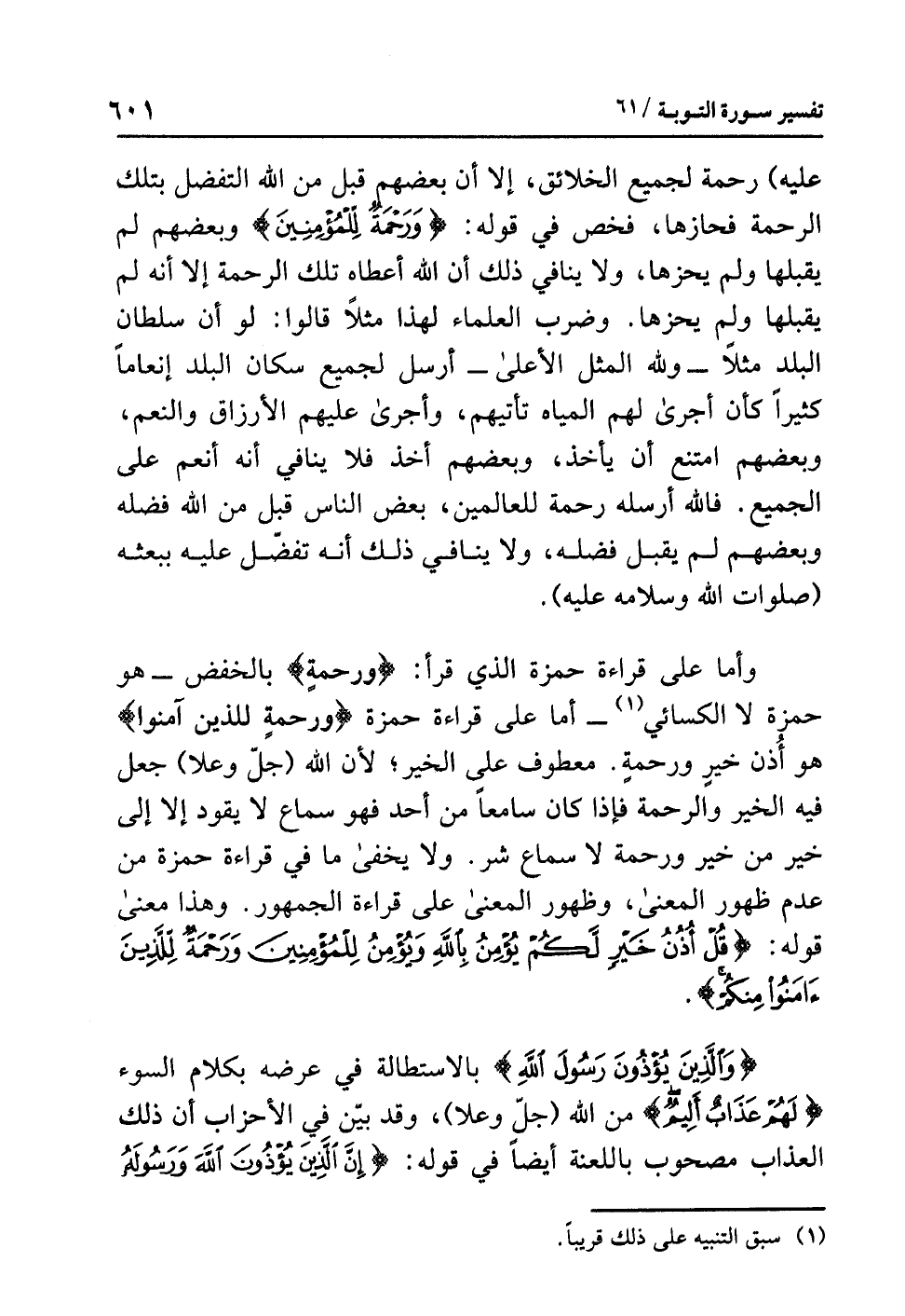 وأما على قراءةِ حمزةَ الذي قَرَأَ: {ورحمةٍ} بالخفضِ - هو حمزةُ لا الكسائي (¬1) - أما على قراءةِ حمزةَ {ورحمةٍ للذين آمنوا} هو أُذُنُ خيرٍ ورحمةٍ. معطوفٌ على الخيرِ؛ لأَنَّ اللَّهَ (جل وعلا) جَعَلَ فيه الخيرَ والرحمةَ فإذا كان سَامِعًا من أحدٍ فهو سماعٌ لا يقودُ إلا إلى خيرٍ من خيرٍ ورحمةٍ لا سماع شَرٍّ. ولا يَخْفَى ما في قراءةِ حمزةَ من عدمِ ظهورِ المعنَى، وظهورُ المعنَى على قراءةِ الجمهورِ. وهذا معنَى قولِه: {قُلْ أُذُنُ خَيْرٍ لَّكُمْ يُؤْمِنُ بِاللَّهِ وَيُؤْمِنُ لِلْمُؤْمِنِينَ وَرَحْمَةٌ لِّلَّذِينَ آمَنُوا مِنْكُمْ}.
