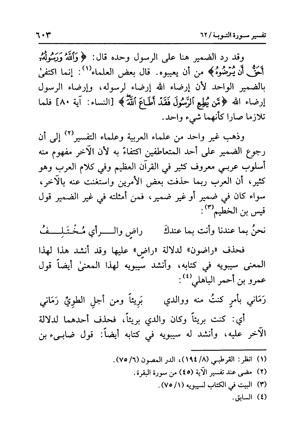 وَذَهَبَ غيرُ واحدٍ من علماءِ العربيةِ وعلماءِ التفسيرِ (¬2) إلى أن رجوعَ الضميرِ على أحدِ المتعاطفينِ اكتفاءً به لأَنَّ الآخَرَ مفهومٌ منه أسلوبٌ عربيٌّ معروفٌ كثيرٌ في القرآنِ العظيمِ وفي كلامِ العربِ وهو كثيرٌ، أن العربَ ربما حَذَفَتْ بعضَ الأمرينِ وَاسْتَغْنَتْ عنه بالآخَرِ، سواء كان في ضميرٍ أو غيرِ ضميرٍ، فَمِنْ أمثلتِه في غيرِ الضميرِ قولُ قيسِ بنِ الخطيمِ (¬3):