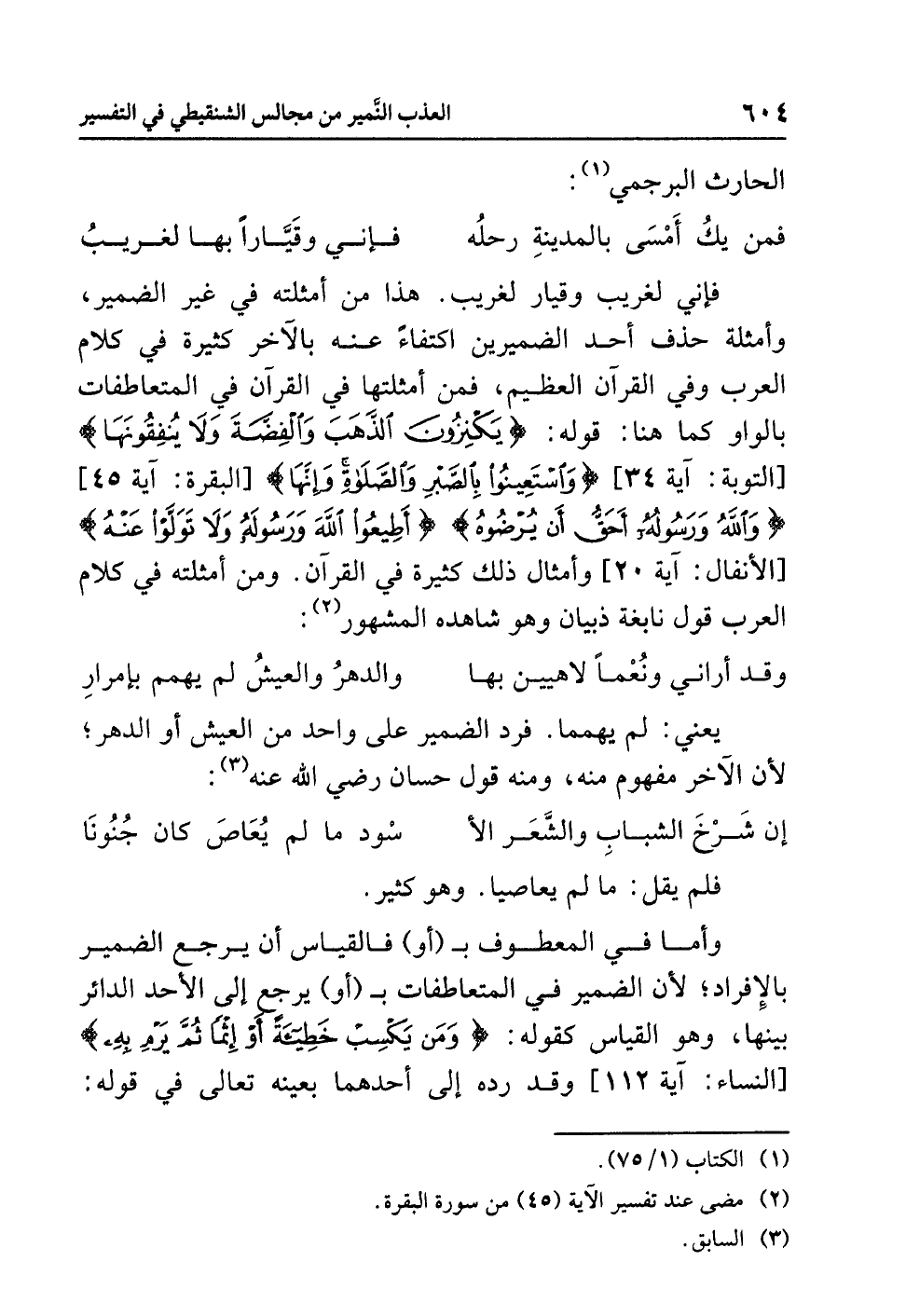 فإني لغريبٌ وقيارٌ لغريبٌ. هذا من أمثلتِه في غيرِ الضميرِ، وأمثلةُ حذفِ أحدِ الضميرينِ اكتفاءً عنه بالآخَرِ كثيرةٌ في كلامِ العربِ وفي القرآنِ العظيمِ، فَمِنْ أمثلتِها في القرآنِ في المتعاطفاتِ بالواوِ كما هنا: قولُه: {يَكْنِزُونَ الذَّهَبَ وَالْفِضَّةَ وَلاَ يُنْفِقُونَهَا} [التوبة: آية 34] {وَاسْتَعِينُوا بِالصَّبْرِ وَالصَّلاَةِ وَإنَّهَا} [البقرة: آية 45] {وَاللَّهُ وَرَسُولُهُ أَحَقُّ أَنْ يُرْضُوهُ} {أَطِيعُوا اللَّهَ وَرَسُولَهُ وَلاَ تَوَلَّوْا عَنْهُ} [الأنفال: آية 20] وأمثالُ ذلك كثيرةٌ في القرآنِ. ومن أمثلتِه في كلامِ العربِ قولُ نابغة ذبيانَ وهو شاهدُه المشهورُ (¬2):