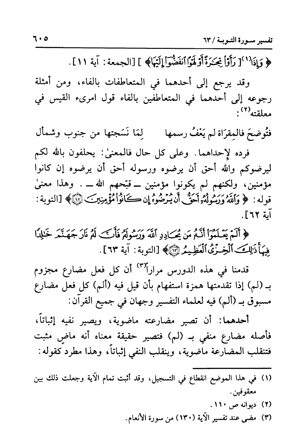 قَدَّمْنَا في هذه الدروسِ مرارًا (¬3) أن كُلَّ فعلٍ مضارعٍ مجزومٍ بـ (لم) إذا تَقَدَّمَتْهُ همزةُ استفهامٍ بأن قيل فيه (أَلَمْ) كل فعل مضارع مسبوق بـ (ألم) فيه لعلماءِ التفسيرِ وجهانِ في جميعِ القرآنِ: