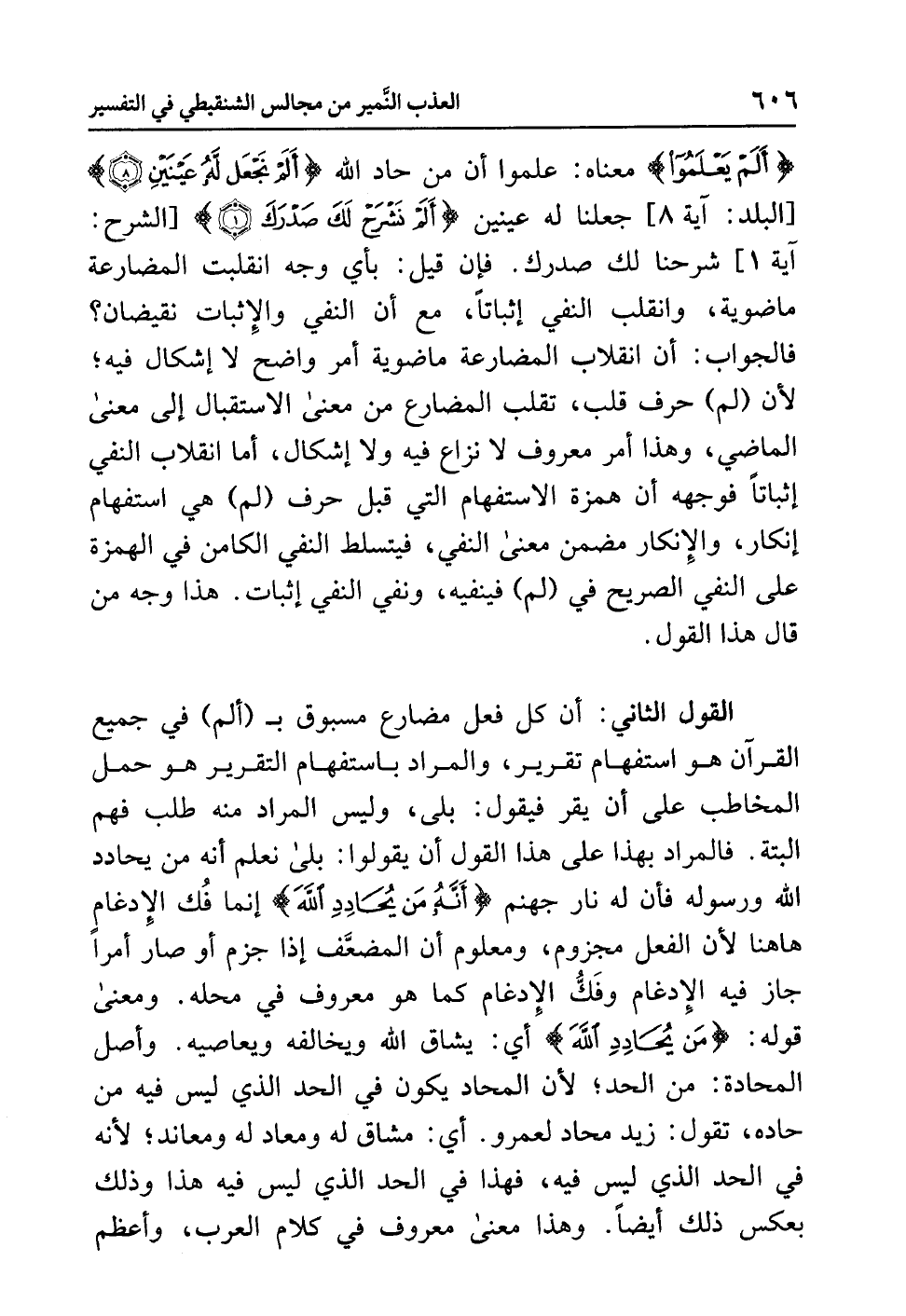 القولُ الثانِي: أن كُلَّ فعلٍ مضارعٍ مسبوقٍ بـ (ألم) في جميعِ القرآنِ هو استفهامُ تقريرٍ، والمرادُ باستفهامِ التقريرِ هو حَمْلُ المخاطَب على أن يُقِرَّ فيقول: بَلَى، وليس المرادُ منه طلبَ فَهْمٍ ألبتةَ. فالمرادُ بهذا على هذا القولِ أن يقولوا: بَلَى نعلمُ أنه من يُحَادِدِ اللَّهَ ورسولَه فأن له نارَ جهنمَ {أَنَّهُ مَنْ يُحَادِدِ اللَّهَ} إنما فُكَّ الإدغامُ هاهنا لأن الفعلَ مجزومٌ، ومعلومٌ أن المضعَّفَ إذا جُزِمَ أو صار أمرًا جَازَ فيه الإدغامُ وفَكُّ الإدغامِ كما هو معروفٌ في محلِّه. ومعنَى قولِه: {مَنْ يُحَادِدِ اللَّهَ} أي: يُشَاقِّ اللَّهَ ويخالفه ويعاصيه. وأصلُ المحادَّةِ: من الحدِّ؛ لأن المحادَّ يكونُ في الحدِّ الذي ليس فيه من حاده، تقول: زيد مُحَادٌّ لعمرو. أي: مشاقٌّ له ومعادٍ له ومعاندٌ؛ لأنه في الحدِّ الذي ليس فيه، فهذا في الحدِّ الذي ليس فيه هذا وذلك بعكس ذلك أيضًا. وهذا معنًى معروفٌ في كلامِ العربِ، وأعظمُ
