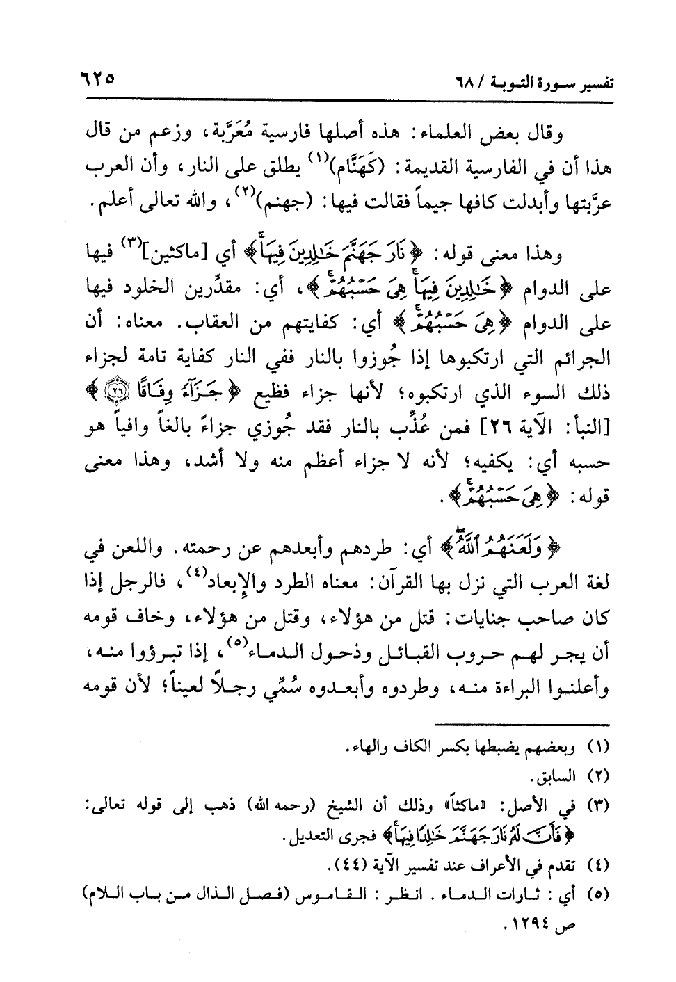 وهذا معنَى قولِه: {نَارَ جَهَنَّمَ خَالِدِينَ فِيهَا} أي [مَاكِثِينَ] (¬3) فيها على الدوامِ {خَالِدِينَ فِيهَا هِيَ حَسْبُهُمْ}، أي: مقدِّرين الخلودَ فيها على الدوامِ {هِيَ حَسْبُهُمْ} أي: كفايتُهم من العقابِ. معناه: أن الجرائمَ التي ارتكبوها إذا جُوزُوا بالنارِ ففي النارِ كفايةٌ تامةٌ لجزاءِ ذلك السوءِ الذي ارْتَكَبُوهُ؛ لأنها جزاءٌ فظيعٌ {جَزَاءً وِفَاقًا (26)} [النبأ: الآية 26] فَمَنْ عُذِّبَ بالنارِ فقد جُوزِيَ جزاءً بالغًا وافيًا وهو حَسْبُهُ: أي يكفيه؛ لأنه لاَ جزاءَ أعظم منه ولا أشد، وهذا معنَى قولِه: {هِيَ حَسْبُهُمْ}.