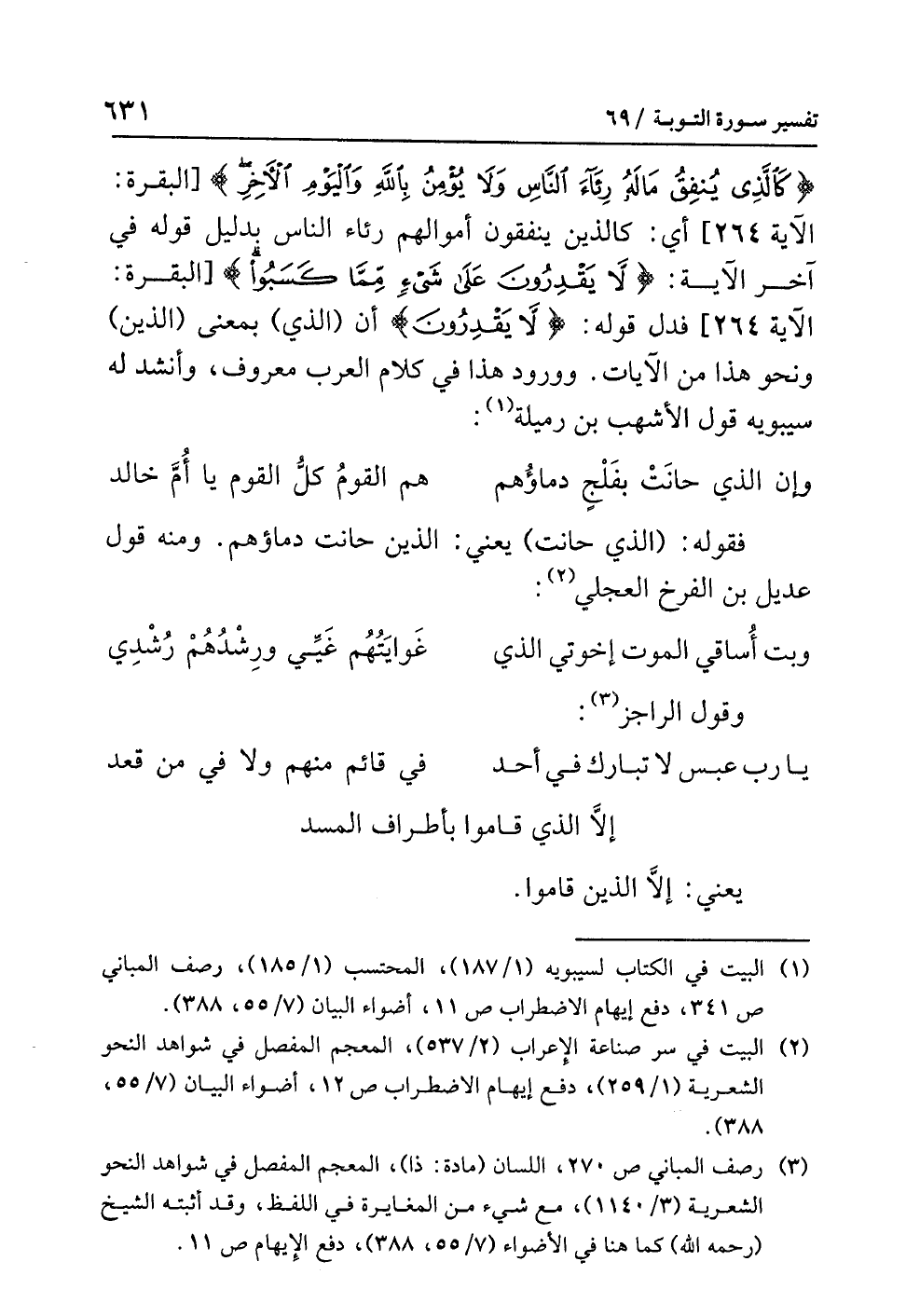 (¬3) رصف المباني ص270، اللسان (مادة: ذا)، المعجم المفصل في شواهد النحو الشعرية (3/ 1140)، مع شيء من المغايرة في اللفظ، وقد أثبته الشيخ (رحمه الله) كما هنا في الأضواء (7/ 55، 388)، دفع الإيهام ص11.
