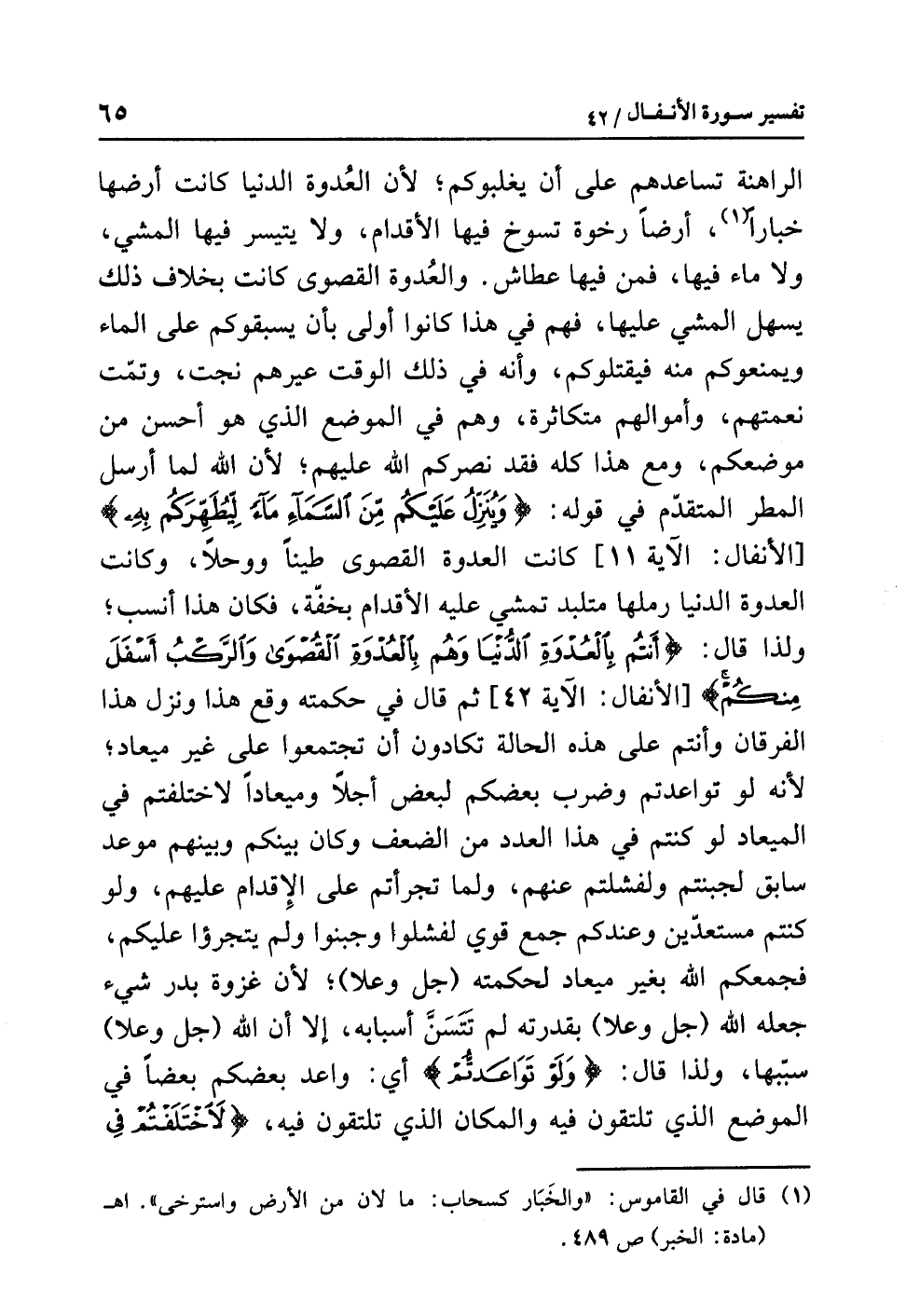 والعُدوة القصوى كانت بخلاف ذلك يسهل المشي عليها، فهم في هذا كانوا أوْلَى بأَنْ يسبقوكم على الماء ويمنعوكم منه فيقتلوكم، وأنه في ذلك الوقت عيرهم نَجَتْ، وتمَّت نعمتهم، وأموالهم متكاثرة، وهم في الموضع الذي هو أحسن من موضعكم، ومع هذا كله فقد نصركم الله عليهم؛ لأن الله لما أرسل المطر المتقدّم في قوله: {وَيُنَزِّلُ عَلَيْكُم مِّن السَّمَاء مَاء لِّيُطَهِّرَكُم بِهِ} [الأنفال: الآية 11] كانت العدوة القصوى طيناً ووحلاً، وكانت العدوة الدنيا رَمْلها متلبِّد تمشي عليه الأقدام بخفة، فكان هذا أنسب، ولذا قال: {أَنتُم بِالْعُدْوَةِ الدُّنْيَا وَهُم بِالْعُدْوَةِ الْقُصْوَى وَالرَّكْبُ أَسْفَلَ مِنكُمْ} [الأنفال: الآية 42] ثم قال في حكمته وقع هذا ونزل هذا الفرقان وأنتم على هذه الحالة تكادون أن تجتمعوا على غير ميعاد؛ لأنه لو تواعدتم وضرب بعضكم لبعض أجلاً وميعاداً لاختلفتم في الميعاد لو كنتم في هذا العدد من الضعف وكان بينكم وبينهم موعد سابق لجبنتم ولفشلتم عنهم، ولما تجرأتم على الإقدام عليهم، ولو كنتم مستعدّين وعندكم جَمْعٌ قَوِيّ لفشلوا وجبنوا ولم يَتَجَرَّءُوا عليكم، فجمعكم الله بغير ميعاد لحكمته (جل وعلا)؛ لأن غزوة بدر شيء جعله الله (جل وعلا) بقدرته لم تَتَسَنَّ أسبابه، إلا أن الله (جل وعلا) سبّبها، ولذا قال: {وَلَوْ تَوَاعَدتَّمْ} أي: واعد بعضكم بعضاً في الموضع الذي تلتقون فيه والمكان الذي تلتقون فيه، {لاَخْتَلَفْتُمْ فِي