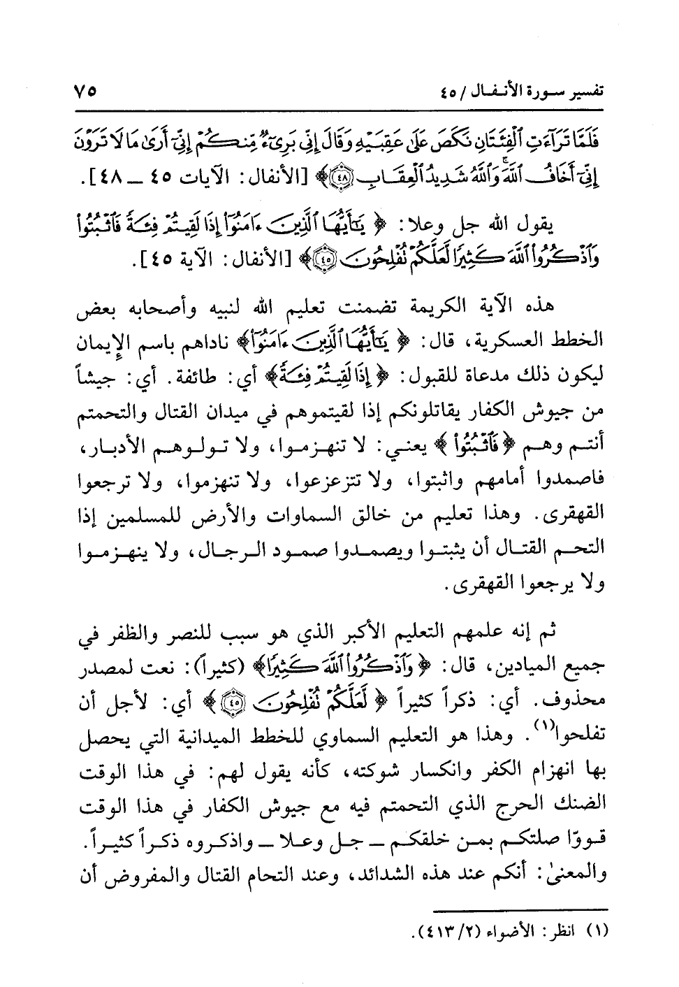 هذه الآية الكريمة تضمنت تعليم الله لنبيِّه وأصحابه بعض الخطط العسكرية، قال: {يَا أَيُّهَا الَّذِينَ آمَنُواْ} ناداهم باسم الإيمان ليكون ذلك مدعاة للقبول: {إِذَا لَقِيتُمْ فِئَةً} أي: طائفة. أي: جيشاً من جيوش الكفار يقاتلونكم إذا لقيتموهم في ميدان القتال والتحمتم أنتم وهم {فَاثْبُتُواْ} يعني: لا تنهزموا، ولا تولوهم الأدبار، فاصمدوا أمامهم واثبتوا، ولا تتزعزعوا، ولا تنهزموا، ولا ترجعوا القهقرى. وهذا تعليم من خالق السماوات والأرض للمسلمين إذا الْتَحَم القتال أن يثبتوا ويصمدوا صمود الرجال، ولا ينهزموا ولا يرجعوا القهقرى.