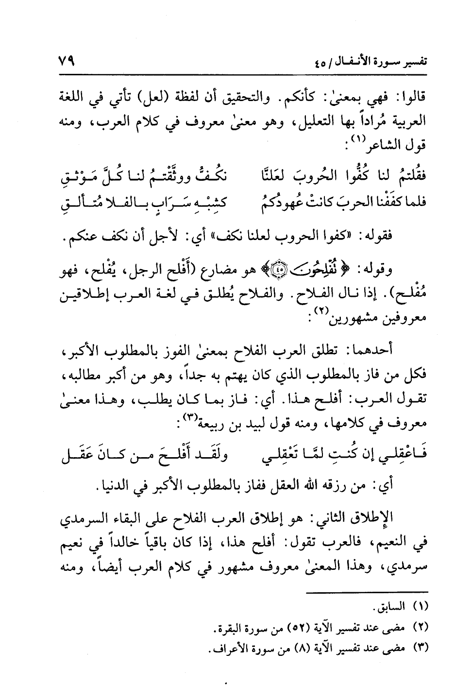 وقوله: {تُفْلَحُونَ} هو مضارع (أفلح الرجل، يفلح، فهو مُفلح): إذا نال الفَلاَح. والفلاح يُطلق في لغة العرب إطلاقين معروفين مشهورين (¬2):