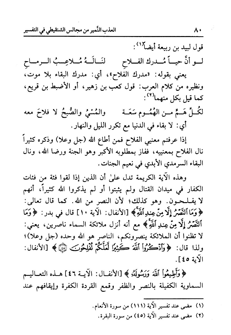 وهذه الآية الكريمة تدل على أن الذين إذا لقوا فئة من فئات الكفار في ميدان القتال ولم يثبتوا أو لم يذكروا الله كثيراً، أنهم لا يفلحون. وهو كذلك؛ لأن النصر من الله. كما قال تعالى: {وَمَا النَّصْرُ إِلاَّ مِنْ عِندِ اللَّهِ} [الأنفال: الآية 10] قال في بدر: {وَمَا النَّصْرُ إِلاَّ مِنْ عِندِ اللَّهِ} مع أنه أنزل ملائكة السماء ناصرين، يعني: لا تظنوا أن الملائكة ينصرونكم، الناصر هو الله وحده (جل وعلا)؛ ولذا قال: {وَاذْكُرُواْ اللَّهَ كَثِيراً لَّعَلَّكُمْ تُفْلَحُونَ} [الأنفال: الآية 45].