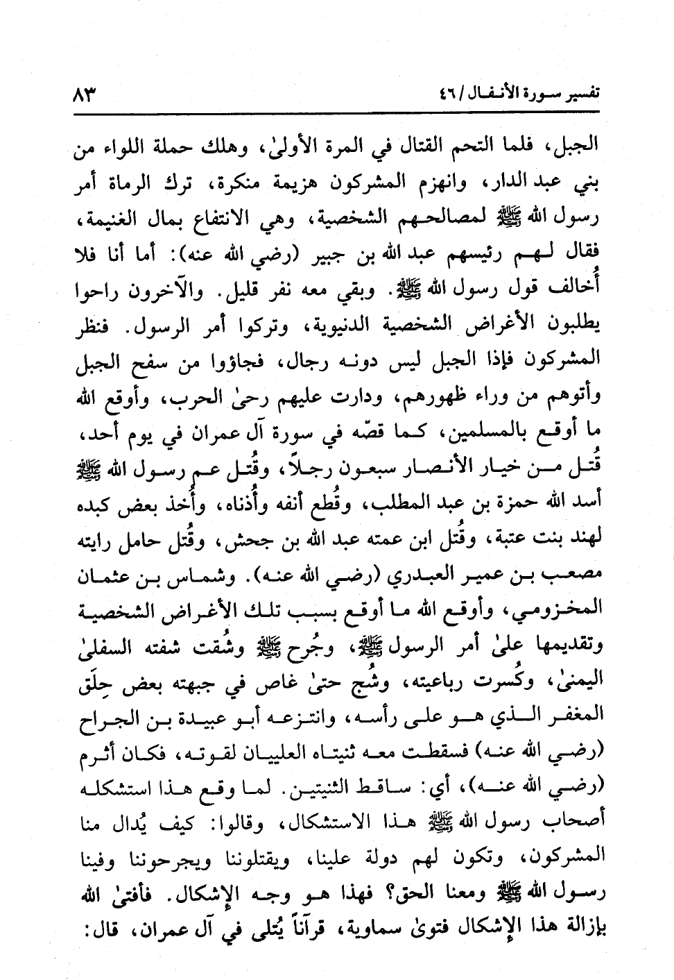 الجبل، فلما الْتَحَمَ القِتَالُ في المرة الأولى، وهلك حملة اللواء مِنْ بَنِي عَبْدِ الدَّارِ، وانهزم المشركون هزيمة منكرة، ترك الرماة أمر رَسُول الله صلى الله عليه وسلم لمصالحهم الشخصية، وهي الانتفاع بمال الغنيمة، فقال لهم رئيسهم عبد الله بن جبير (رضي الله عنه): أما أنا فلا أخالف قول رَسُول الله صلى الله عليه وسلم. وبقي معه نَفَرٌ قَلِيل. والآخرون راحوا يطلبون الأغراض الشخصية الدنيوية، وتَرَكُوا أمْرَ الرَّسُول. فنَظَرَ المُشْرِكُونَ فَإِذا الجَبَلُ ليس دونه رجال، فجاءوا مِنْ سَفْحِ الجَبَلِ وأتوهم مِنْ وَرَاءِ ظهورهم، ودارت عليهم رَحَى الحرب، وأوقع الله ما أوقع بالمسلمين، كما قَصَّهُ في سورة آل عمران في يوم أحد، قُتل مِنْ خِيَارِ الأنْصَار سبعون رجلاً، وقُتل عَمّ رَسُول الله صلى الله عليه وسلم أسَد الله حمزة بن عبد المطلب، وقُطِعَ أنْفُهُ وأذُناه، وأُخذ بعض كبده لهِنْد بِنْت عُتْبة، وقُتِلَ ابْنُ عمته عبد الله بن جحش، وقتل حامل رايته مُصْعَب بن عمير العَبْدَرِي (رضي الله عنه). وشَمَّاس بن عثمان المخْزُومِيّ، وأوقع الله ما أوْقَع بسبب تلك الأغراض الشخْصيَّة وتقديمها على أمر الرسول صلى الله عليه وسلم، وجُرح صلى الله عليه وسلم وشُقَّت شَفَتُهُ السُّفْلَى اليُمْنَى، وكُسِرَتْ رَبَاعيَّته، وشُجَّ حتى غَاص في جَبْهَتِهِ بعض حِلَق المغفر الذي هو على رأسه، وانْتَزَعَهُ أبو عبيدة بن الجراح (رضي الله عنه) فسقطت معه ثنيتاه العلييان لقوته، فكان أثرم (رضي الله عنه)، أي: ساقط الثنيتين. لما وقع هذا استشكله أصحاب رَسُول الله صلى الله عليه وسلم هذا الاستشكال، وقالوا: كيف يُدال منا المُشْرِكُون، وتكون لهم دولة عَلَيْنَا، ويقتلوننا ويجْرَحُونَنا وفِينَا رَسُول الله صلى الله عليه وسلم ومعنا الحَق؟ فهذا هو وجه الإشكال.