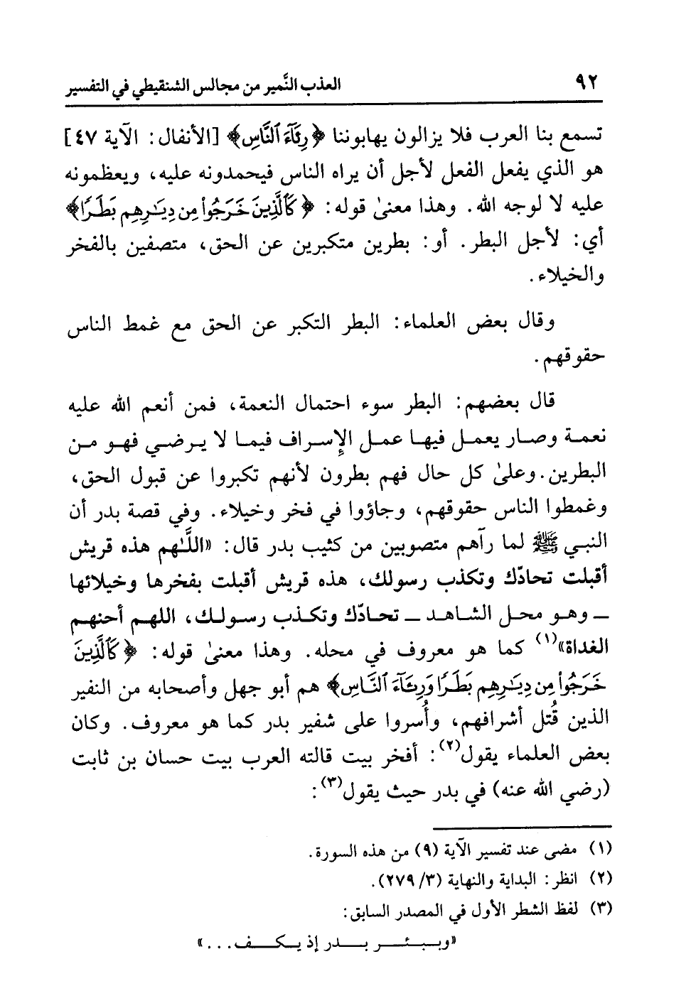 قال بعضهم: البطر: سوء احتمال النعمة، فمَنْ أنْعَمَ الله عليه نعمة وصار يعمل فيها عمل الإسراف فيما لا يرضي فهو مِن البَطِرِينَ. وعلى كل حال فهم بطرون؛ لأنهم تكبروا عن قبول الحق، وغمطوا الناس حقوقهم، وجاءوا في فخر وخيلاء. وفي قصة بدر أن النبي صلى الله عليه وسلم لما رآهم متصوِّبِينَ مِنْ كَثِيب بدر قال: «اللَّهُمَّ هَذِهِ قُرَيْشٌ أَقْبَلَتْ تَحَادُّكَ وتُكَذِّبُ رَسُولَكَ، هَذِهِ قُرَيْشٌ أَقْبَلَتْ بِفَخْرِهَا وَخُيَلائِهَا - وهو محل الشاهد - تحادّك وتكذب رَسُولَكَ، اللَّهُمَّ أحْنِهِمُ الغَدَاةَ» (¬1) كما هو معروف في محله. وهذا معنى قوله: {كَالَّذِينَ خَرَجُواْ مِن دِيَارِهِم بَطَراً وَرِئَاء النَّاسِ} هم أبو جهل وأصحابه من النفير الذين قُتل أشرافهم، وأسروا على شفير بدر كما هو معروف.