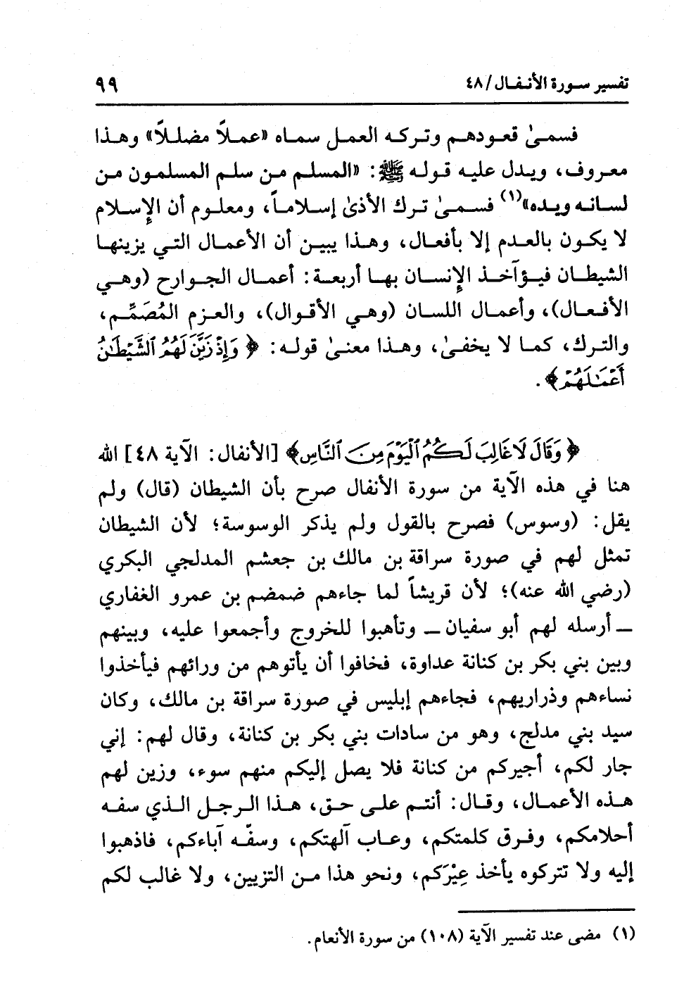 {وَقَالَ لاَ غَالِبَ لَكُمُ الْيَوْمَ مِنَ النَّاسِ} [الأنفال: الآية 48] الله هنا في هذه الآية من سورة الأنفال صرح بأن الشيطان (قال) ولم يقل: (وسوس) فصرح بالقول ولم يذكر الوسوسة؛ لأن الشيطان تَمَثَّلَ لهم في صورة سراقة بن مالك بن جعشم المدلجي البَكْرِي (رضي الله عنه)؛ لأن قريشاً لما جاءهم ضَمْضَم بن عمرو الغفاري -أرسله لهم أبو سفيان- وتأَهَّبُوا للخُرُوجِ وأجمعوا عليه، وبينهم وبين بني بكر بن كنانة عداوة، فخافوا أن يأتوهم من ورائهم فيأخذوا نساءهم وذراريهم، فجاءهم إبليس في صورة سراقة بن مالك، وكان سيد بني مدلج، وهو من سادات بَنِي بَكْر بن كنانة، وقال لهم: إني جار لكم، أجيركم من كنانة فلا يصل إليكم منهم سوء، وَزَيَّنَ لهُمْ هذه الأعمال، وقال: أنتم على حق، هذا الرجل الذي سفه أحلامكم، وفَرَّقَ كَلِمَتَكُمْ، وعَابَ آلهتكم، وسفَّهَ آباءكم، فاذهبوا إليه ولا تتركوه يأخذ عِيرَكم، ونحو هذا من التَّزْيين، ولا غالب لكم