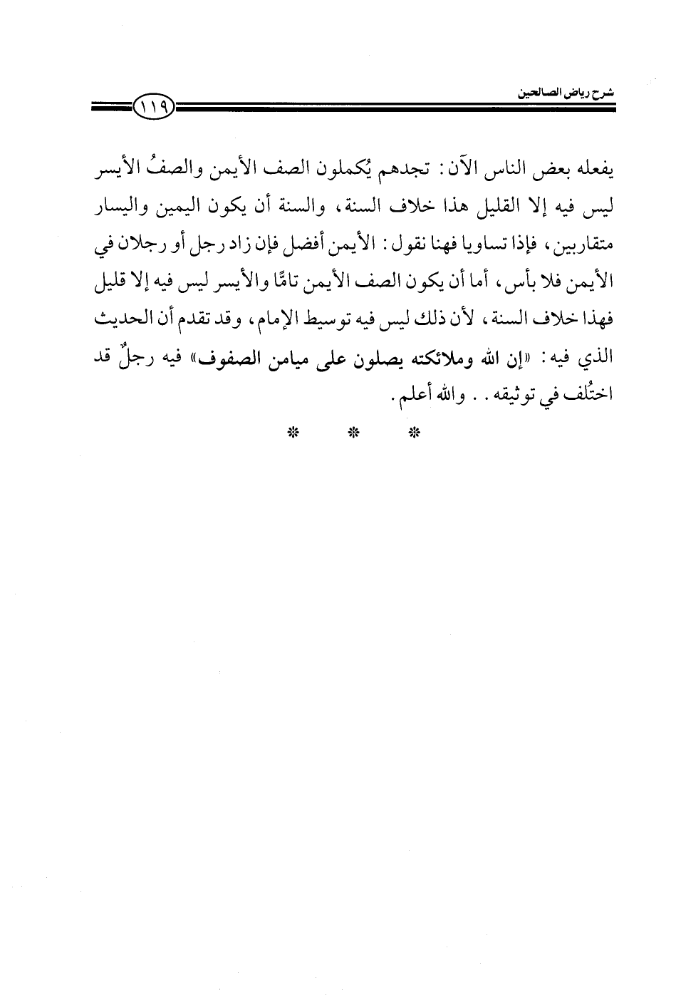 يفعله بعض الناس الآن تجدهم يكملون الصف يمينا والأيسر ليس فيه إلا القليل هذا خلاف السنة السنة أن يكون اليمين واليسار متقاربين فإذا تساويا فهنا نقول الأيمن أفضل فإن زاد رجل أو رجلان في الإيمن فلا بأس أما أن يكون الأيمن تاما والأيسر ليس فيه إلا قليل فهذا خلاف السنة لأنه ليس فيه توسيط الإمام وقد عرفتم أن الحديث الذي فيه إن الله وملائكته يصلون على ميامين الصفوف فيه رجل قد اختلف في توثيقه ...