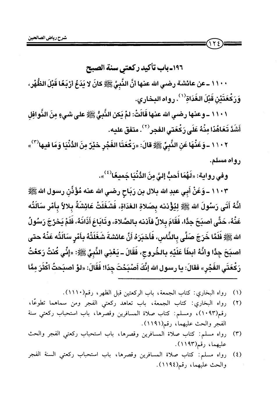 1101 - وعنها قالت لم يكن النبي صلى الله عليه وسلم على شيء من النوافل أشد تعاهدا منه على ركعتي الفجر متفق عليه