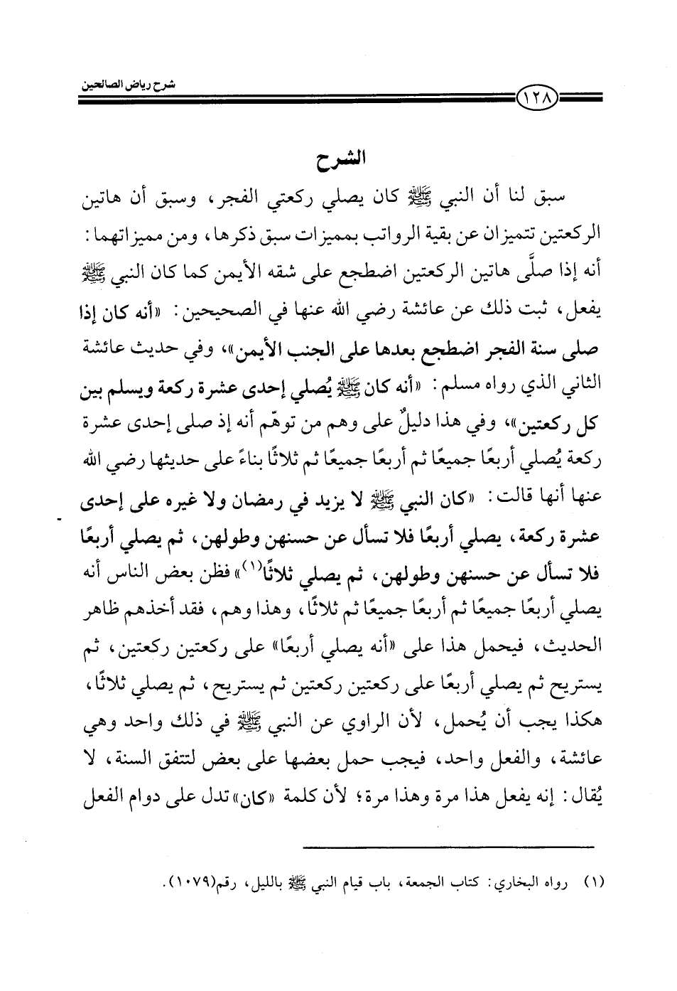 EXسبق لنا أن النبي صلى الله عليه وسلم كان يصلي ركعتي الفجر وسبق أن هاتين الركعتين تتميزان عن بقية الرواتب بميزات سبق ذكرها ومن مميزاتها أنه إذا صلى هاتين الركعتين اضطجع على شقة الأيمن كما قال النبي صلى الله عليه وسلم يفعل ثبت ذلك عن عائشة رضي الله عنها في الصحيحين أنه كان إذا صلى سنة الفجر اضطجع بعدها على الجنب الأيمن وفي حديث عائشة الثاني الذي رواه مسلم أنه كان صلى الله عليه وسلم يصلي إحدى عشرة ركعة يسلم بين كل ركعتين وفي هذا دليل على وهم من توهم أنه إذا صلى إحدى عشرة ركعة يصلي أربعا أربعا ثم ثلاثا بناء على حديثها رضي الله عنها أنها قالت كان النبي لا يزيد في رمضان ولا غيره على إحدى عشرة ركعة يصلي أربعا فلا يسأل عن حسنهن وطولهن ثم أربعا فلا يسأل عن حسنهن وطولهن ثم ثلاثا فظن بعض الناس أنه يصلي أربعا جميعا ثم أربعا جميعا ثم ثلاثا وهذا وهم فقد أخذوا بظاهر الحديث فيحمل هذا على أنه يصلي أربعا على ركعتين ركعتين ثم يستريح ثم يصلي أربعا على ركعتين ركعتين ثم يستريح ثم يصلي ثلاثا هكذا يجب أن يحمل لأن الراوي عن النبي صلى الله عليه وسلم في ذلك واحد وهي عائشة والفعل واحد فيجب حمل بعضها على بعض لتتفق السنة لا يقال إنه يفعل هذا مرة وهذا مرة لأن كلمة كان تدل على دوام الفعل