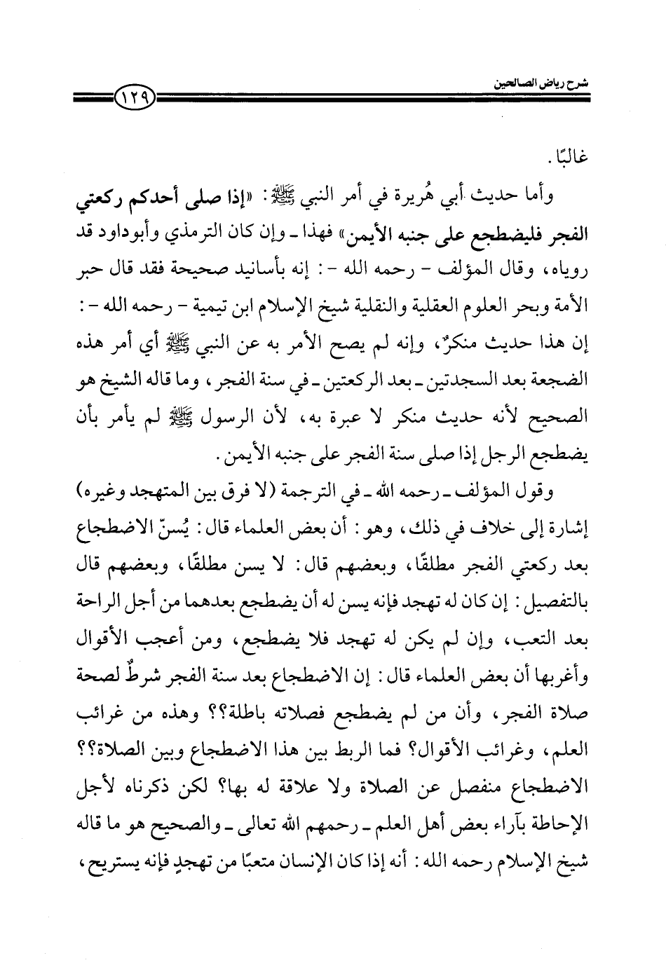 غالبا وأما حديث أبي هريرة في أمر النبي صلى الله عليه وسلم من صلى ركعتي الفجر أن يضطجع على جنبه الأيمن فهذا وإن كان الترمذي وأبو داود قد روياه وقال المؤلف إنه بأسانيد صحيحة فقد قال حبر الأمة وبحر العلوم العقلية والنقلية شيخ الإسلام ابن تيمية إن هذا حديث منكر وإنه لم يصح الأمر به عن النبي صلى الله عليه وسلم وهذا هو الصحيح لأن الرسول لم يأمر بأن يضطجع الرجل إذا صلى سنة الفجر على جنبه الأيمن وقول المؤلف رحمه الله في الترجمة لا فرق بين المتهجد وغيره إشارة إلى خلاف في ذلك وهو أن بعض العلماء قال يسن الاضطجاع بعد ركعتي الفجر مطلقا وبعضهم قال لا يسن مطلقا وبعضهم قال بالتفصيل إن كان له تهجد فإنه يسن له أن يضطجع بعدهما من أجل الراحة بعد التعب وإن لم يكن له تهجد فلا يضطجع ومن أعجب الأقوال وأغربها أن بعض العلماء قال إن الاضطجاع بعد سنة الفجر شرط لصحة صلاة الفجر وأن من لم يضطجع فصلاته باطلة وهذه من غرائب العلم وغرائب الأقوال ما الرابط بين هذا الاضطجاع وبين صلاة الفجر الجهة منفصلة عن الصلاة ولا علاقة لها بالاضطجاع لكن ذكرناه لأجل أن تعجبوا من آراء بعض أهل العلم رحمهم الله أنهم يقولون أقوالا لا يدل عليها نقل ولا عقل والصحيح هو ما قاله شيخ الإسلام أنه إذا كان الإنسان متعبا من تهجده فإنه يستريح