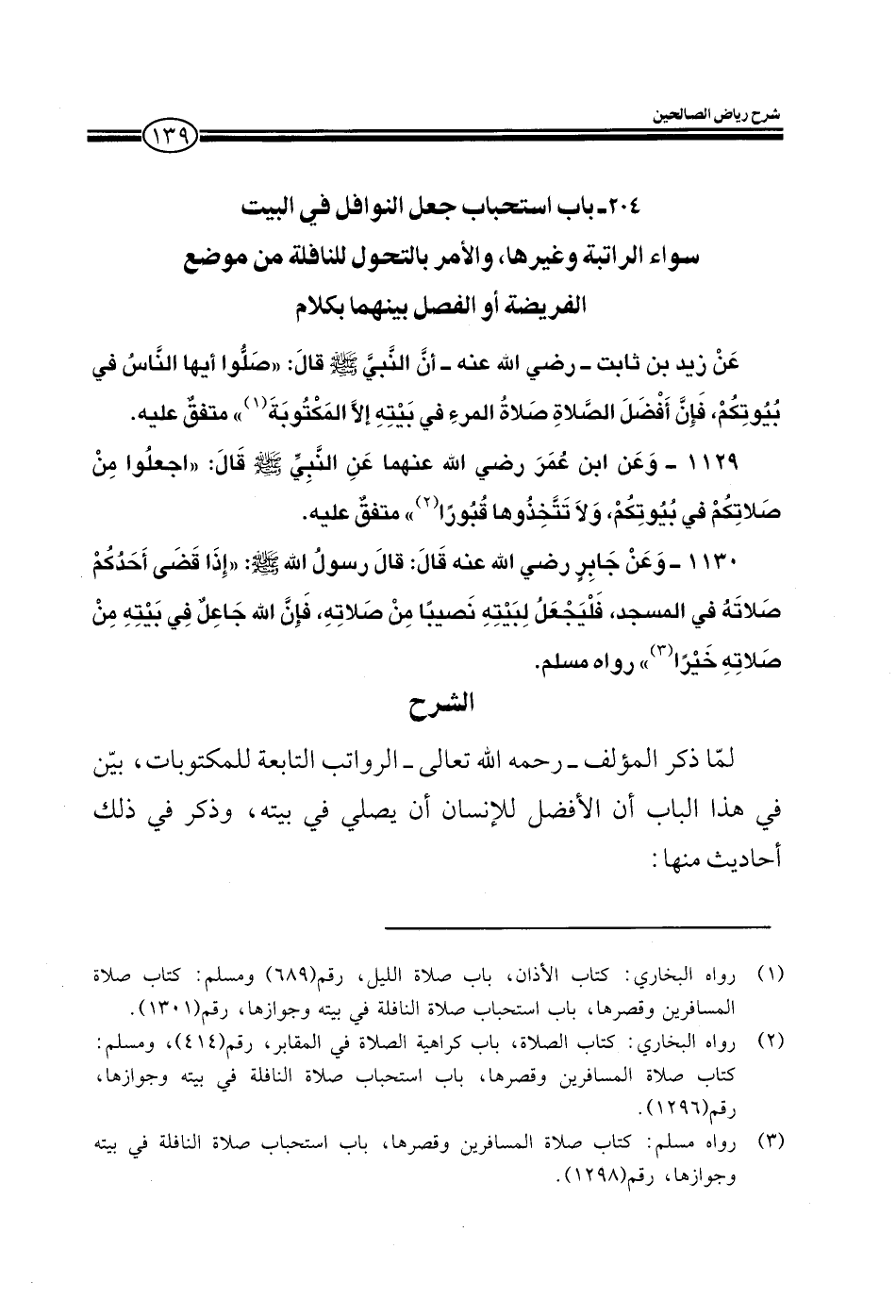 1128 - عن زيد بن ثابت رضي الله عنه أن النبي صلى الله عليه وسلم قال صلوا أيها الناس في بيوتكم فإن أفضل الصلاة صلاة المرء في بيته إلا المكتوبة متفق عليه