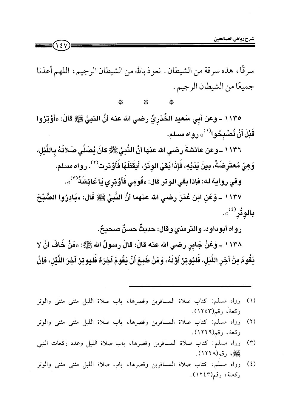 1135 - وعن أبي سعيد الخدري رضي الله عنه أن النبي صلى الله عليه وسلم قال أوتروا قبل أن تصبحوا رواه مسلم