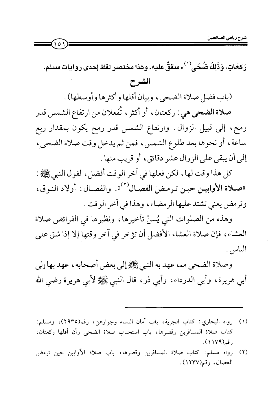 EXباب فضل صلاة الضحى وبيان أقلها وأكثرها وأوسطها صلاة الضحى هي: ركعتان أو أكثر تفعلان من ارتفاع الشمس قدر رمح إلى قبيل الزوال.