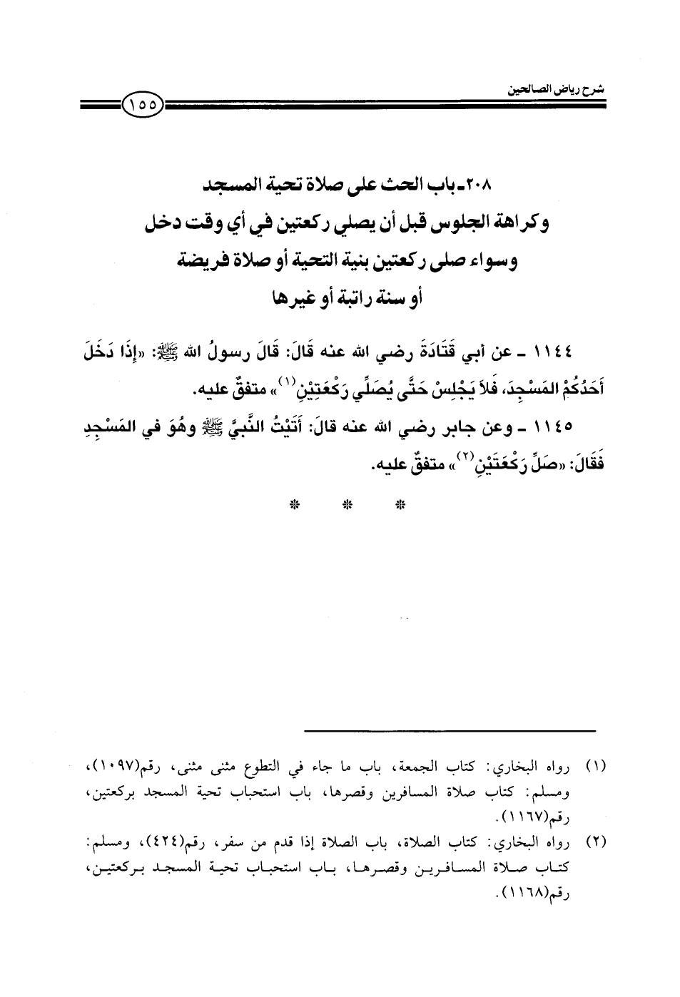 1144 - عن أبي قتادة رضي الله عنه قال: قال رسول الله صلى الله عليه وسلم: إذا دخل أحدكم المسجد، فلا يجلس حتى يصلي ركعتين متفق عليه.