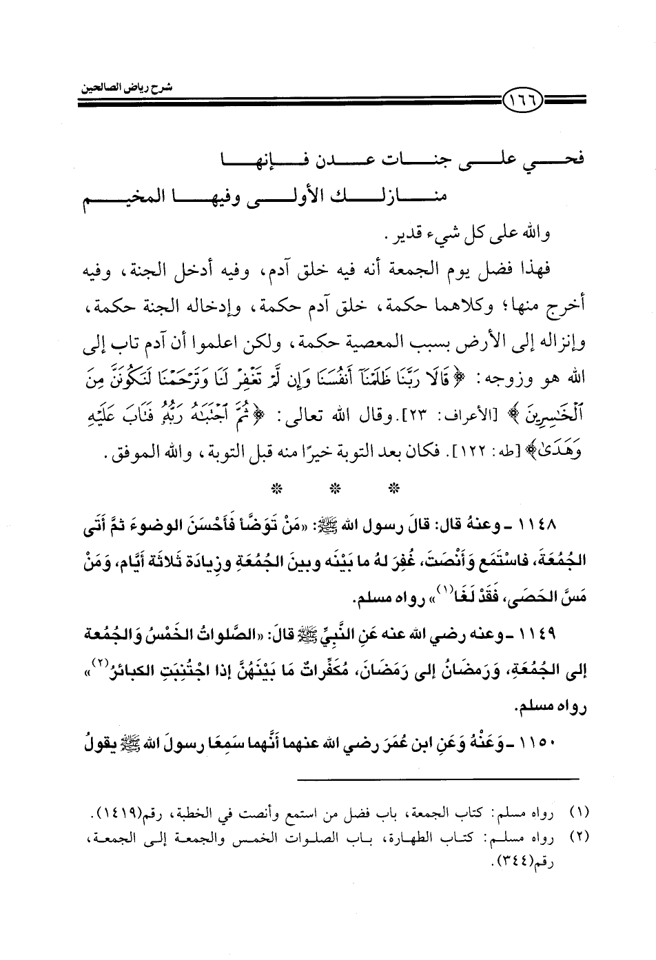والله على كل شيء قدير، فهذا فضل يوم الجمعة أنه فيه خلق آدم، وفيه أدخل الجنة، وفيه أخرج منها، وكلاهما حكمة: خلق آدم حكمة، إدخاله الجنة حكمة، إنزاله إلى الأرض بسبب المعصية حكمة، ولكن اعلموا أن آدم تاب إلى الله هو وزوجه {قالا ربنا ظلمنا أنفسنا وإن لم تغفر لنا وترحمنا لنكونن من الخاسرين} وقال الله تعالى: {ثم اجتباه ربه فتاب عليه وهدى} فكان بعد التوبة خيرا منه قبل التوبة، والله الموفق