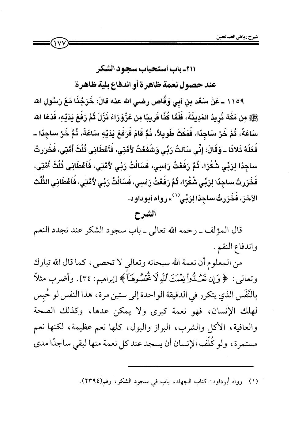 1159 - عن سعد بن أبي وقاص رضي الله عنه قال: خرجنا مع رسول الله صلى الله عليه وسلم من مكة نريد المدينة، فلما كنا قريبا من عزوراء نزل ثم رفع يديه فدعا الله ساعة ثم خر ساجدا فمكث طويلا ثم قام فرفع يديه ساعة، ثم خر ساجدا فعله ثلاثا وقال: إني سألت ربي، وشفعت لأمتي، فأعطاني ثلث أمتي، فخررت ساجدا لربي شكرا، ثم رفعت رأسي فسألت ربي لأمتي، فأعطاني ثلث أمتي، فخررت ساجدا لربي شكرا، ثم رفعت رأسي فسألت ربي لأمتي، فأعطاني الثلث الآخر، فخررت ساجدا لربي رواه أبو داود