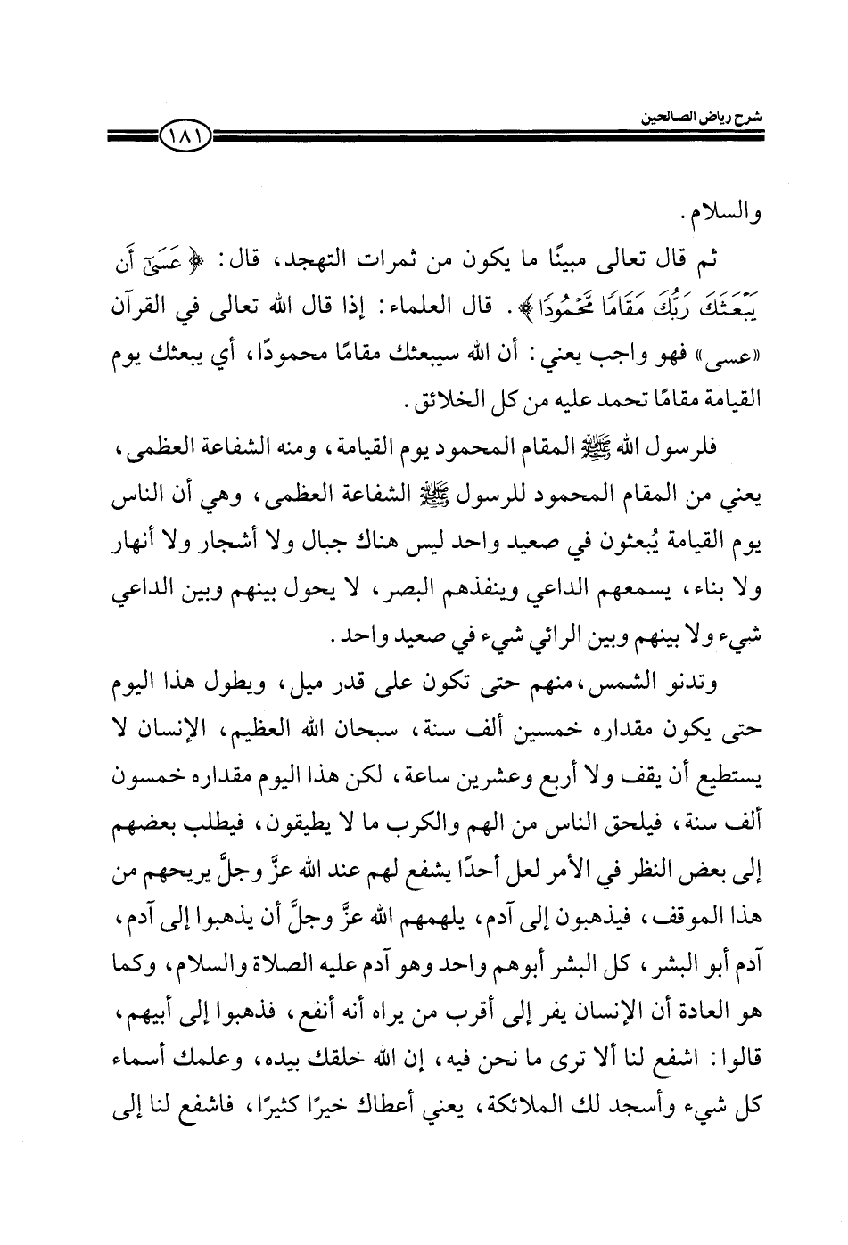فلرسول الله صلى الله عليه وسلم المقام المحمود يوم القيامة، ومنه الشفاعة العظمى، يعني من المقام المحمود للنبي صلى الله عليه وسلم الشفاعة العظمى، وهي أن الناس يوم القيامة يبعثون في صعيد واحد ليس هناك جبال ولا أشجار ولا بناء ولا أنهار، يسمعهم الداعي وينفذهم البصر، لا يحول بينهم وبين الداعي شيء ولا بينهم وبين الرائي شيء في صعيد واحد.