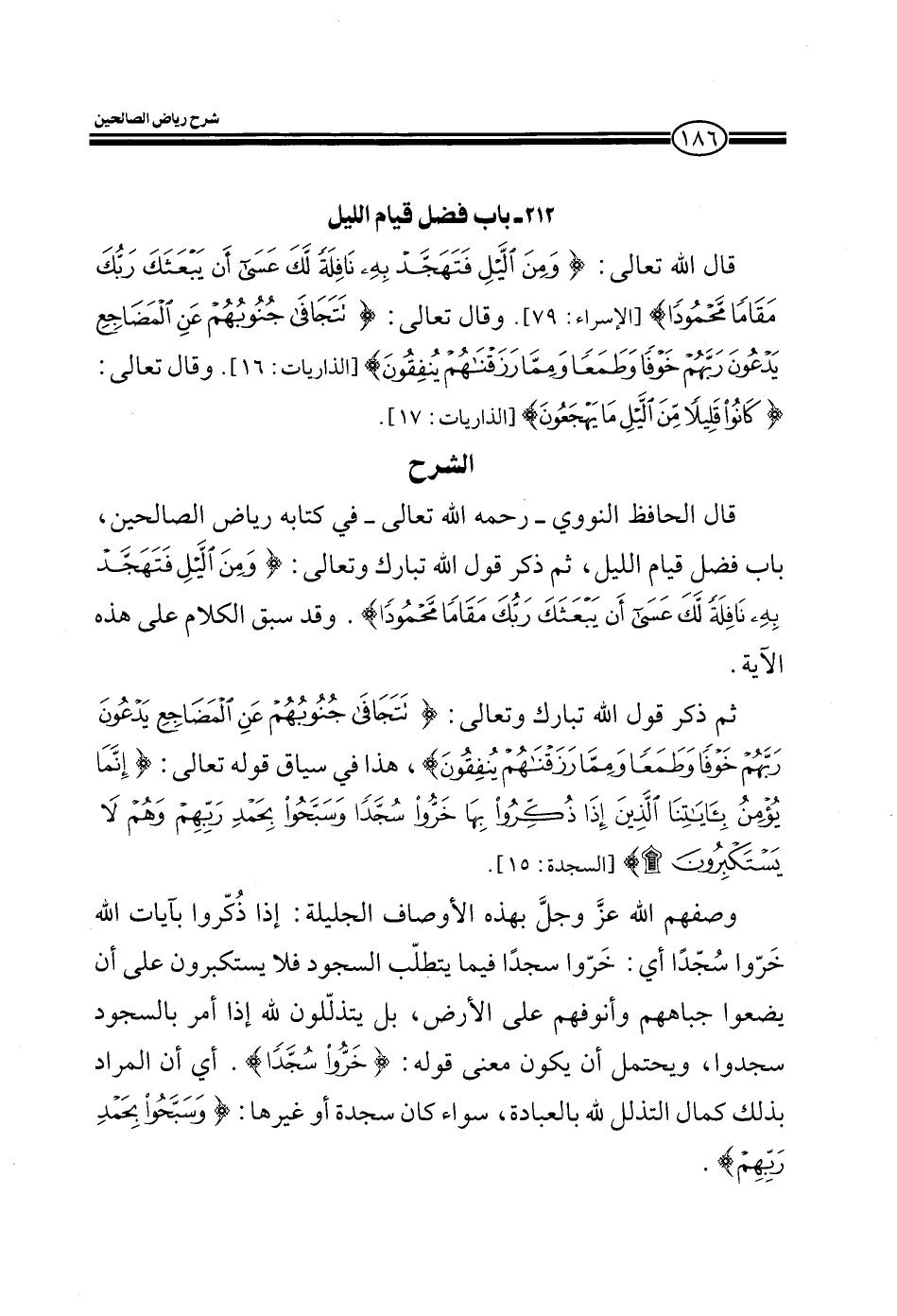 قال الله تعالى: {ومن الليل فتهجد به نافلة لك عسى أن يبعثك ربك مقاما محمودا} وقال تعالى: {تتجافى جنوبهم عن المضاجع} وقال تعالى {كانوا قليلا من الليل ما يهجعون} قال المؤلف النووي رحمه الله في كتابه رياض الصالحين باب فضل قيام الليل، ثم ذكر قول الله تبارك وتعالى: {ومن الليل فتهجد به نافلة لك عسى أن يبعثك ربك مقاما محمودا} وسبق الكلام على هذه الآية، ثم ذكر قول الله تبارك وتعالى {تتجافى جنوبهم عن المضاجع يدعون ربهم خوفا وطمعا ومما رزقناهم ينفقون} هذا في سياق قوله تعالى: {إنما يؤمن بآياتنا الذين إذا ذكروا بها خروا سجدا وسبحوا بحمد ربهم وهم لا يستكبرون} فوصفهم الله عز وجل بهذه الأوصاف الجليلة: إذا ذكروا بآيات الله خروا سجدا، أي خروا سجدا فيما يتطلب السجود فلا يستكبرون عن وضع جباههم وأنوفهم على الأرض بل يتذللون لله إذا أمر بالسجود سجدوا، ويحتمل أن يكون معنى قوله: {خروا سجدا} أي: أن المراد بذلك كمال التذلل لله بالعبادة، سواء كان سجدة أو غيرها، {وسبحوا بحمد ربهم}