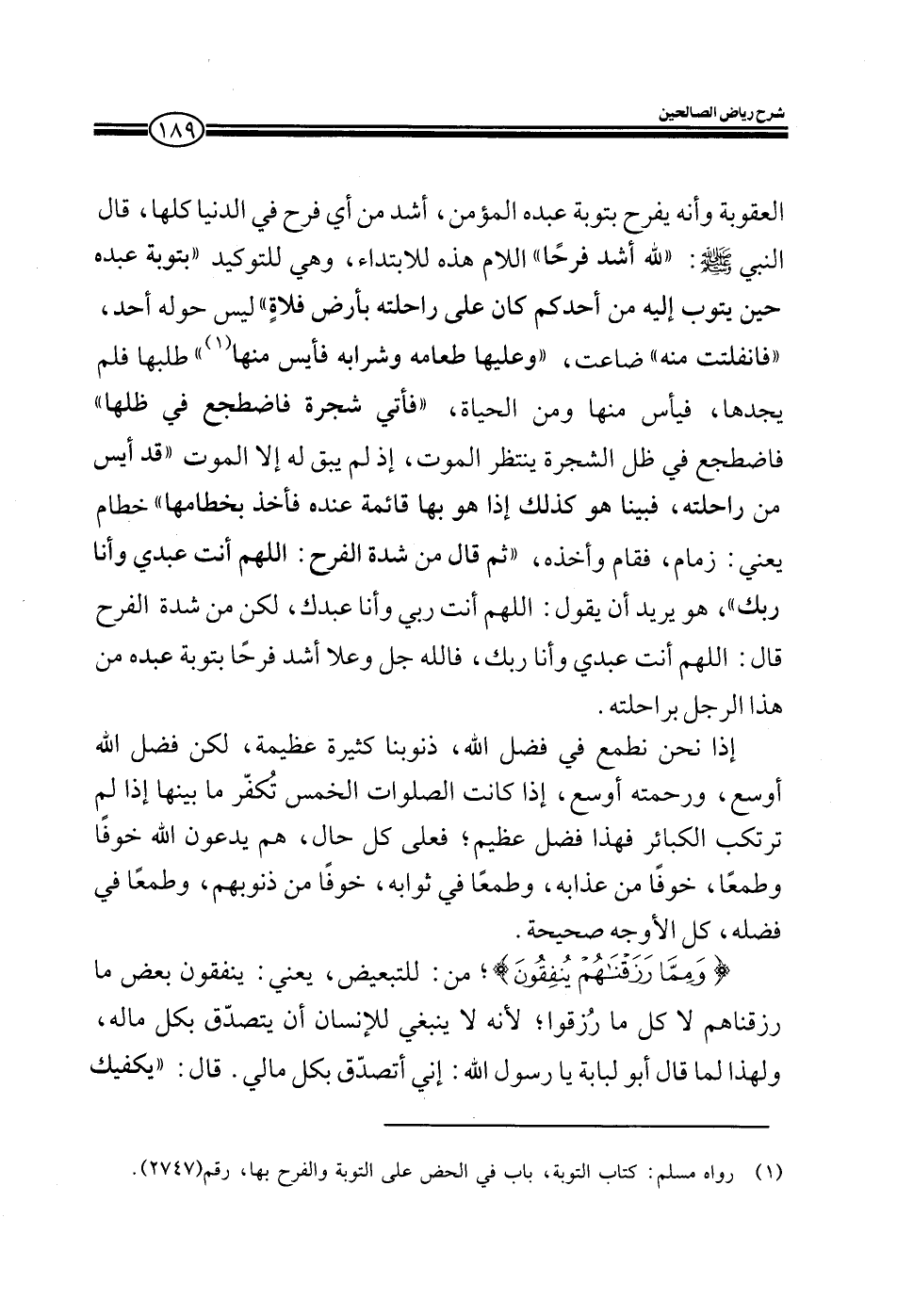 العقوبة، وأنه يفرح بتوبة عبده المؤمن، أشد من أي فرح في الدنيا كلها، قال النبي عليه الصلاة والسلام: لله أشد فرحا اللام هذه للابتداء، وهي للتوكيد، لله أشد فرحا بتوبة عبده من أحدكم كان معه راحلته عليها طعامه وشرابه فأضلت ضاعت منه في أرض فلاة ما حوله أحد، فضاعت، طلبها فلم يجدها، فيئس من الحياة، فاضطجع تحت شجرة ينتظر الموت، ما بقي إلا أن يموت، فإذا بخطام الناقة متعلقا بالشجرة خطام يعني: زمام فقام وأخذه وقال من شدة الفرح: اللهم أنت عبدي وأنا ربك هو يريد أن يقول: اللهم أنت ربي وأنا عبدك لكن من شدة الفرح قال: اللهم أنت عبدي وأنا ربك , فالله جل وعلا أشد فرحا بتوبة عبده من هذا الرجل براحلته.