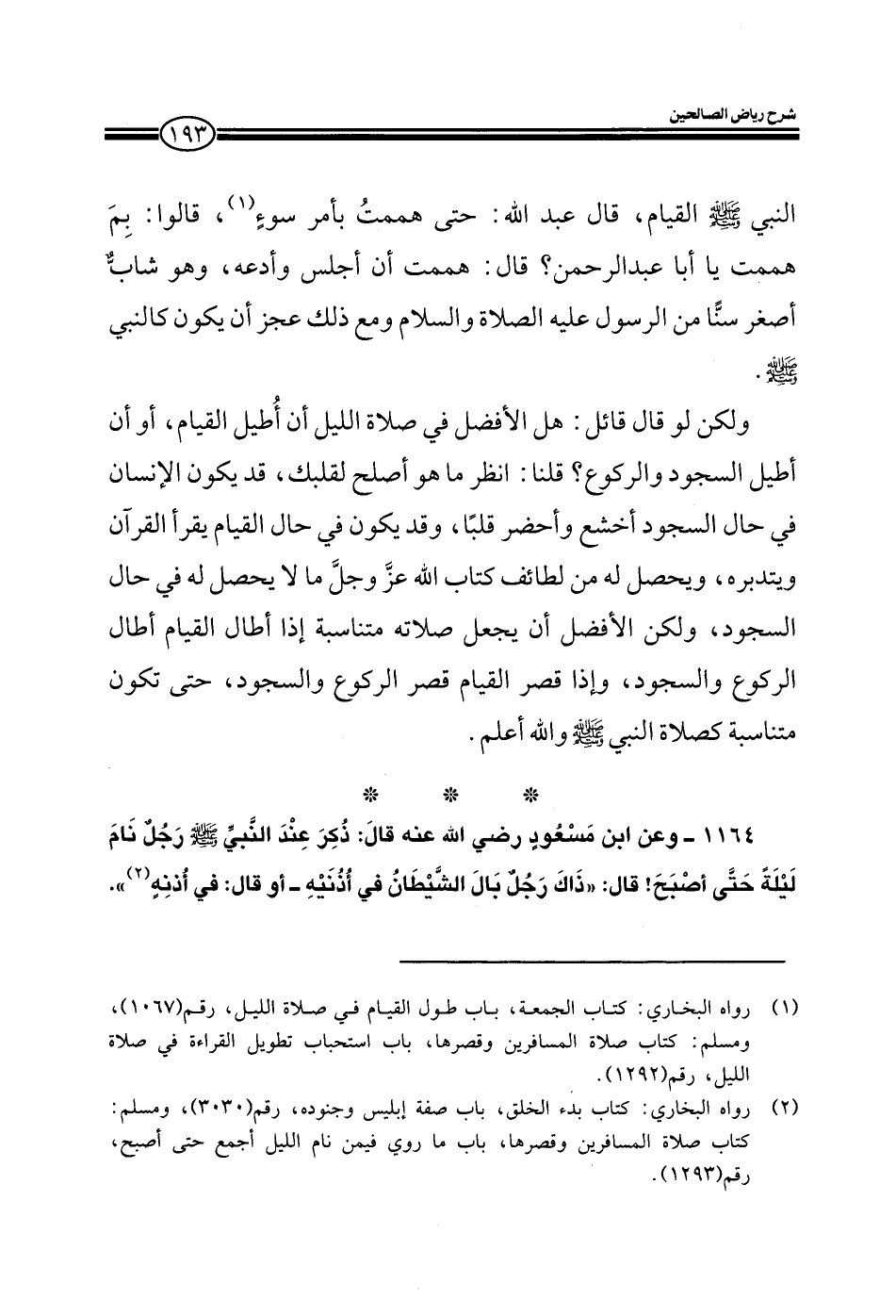1164 - وعن ابن مسعود رضي الله عنه قال: ذكر عند النبي صلى الله عليه وسلم رجل نام ليلة حتى أصبح، قال: ذاك رجل بال الشيطان في أذنيه، أو قال: في أذنه