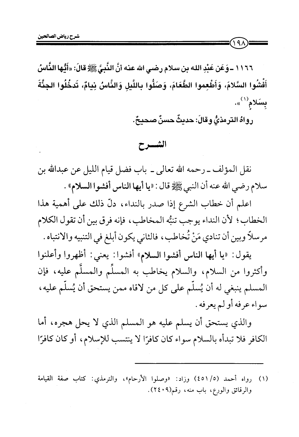 EXنقل المؤلف النووي رحمه الله في كتابه رياض الصالحين في باب فضل قيام الليل عن عبد الله بن سلام رضي الله عنه قال: قال رسول الله صلى الله عليه وسلم: يا أيها الناس أفشوا السلام.