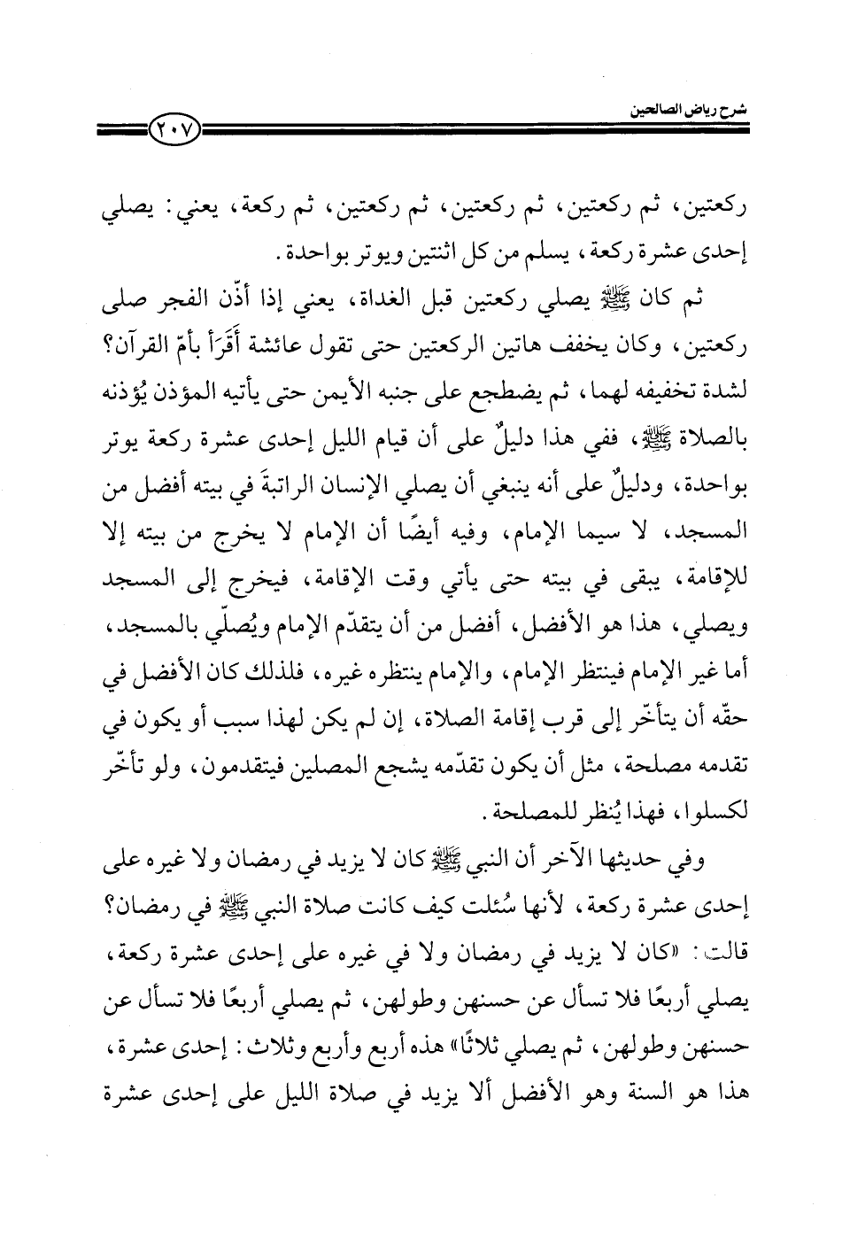 ركعتين ثم ركعتين ثم ركعتين، ثم ركعتين، ثم ركعة، يعني: يصلي إحدى عشرة ركعة، يسلم من اثنتين، ويوتر بواحدة، ثم كان صلى الله عليه وسلم يصلي ركعتين قبل الغداة، يعني إذا أذن الفجر صلى ركعتين، وكان يخفف هاتين الركعتين حتى تقول عائشة أقرأ بأم القرآن؟ لشدة تخفيفه لهما، ثم يضطجع على جنبه الأيمن حتى يأتيه المؤذن يؤذنه بالصلاة صلى الله عليه وسلم ففي هذا دليل على أن قيام الليل إحدى عشرة ركعة يوتر بواحدة، ودليل على أنه ينبغي أن يصلي الإنسان الراتبة في بيته أفضل من المسجد، لاسيما الإمام، وفيه أيضا أن الإمام لا يخرج من بيته إلا للإقامة، يبقى في بيته حتى يأتي وقت الإقامة، فيخرج إلى المسجد ويصلي، هذا هو الأفضل أفضل من أن يتقدم الإمام ويصلي بالمسجد أما غير الإمام فينتظر الإمام، والإمام ينتظره غيره، فلذلك كان الأفضل في حقه أن يتأخر إلى قرب إقامة الصلاة، إن لم يكن لهذا سبب أو في تقدمه مصلحة مثل أن يكون تقدمه يشجع المصلين فيتقدمون، ولو تأخر لكسلوا، فهذا أيضا للمصلحة.