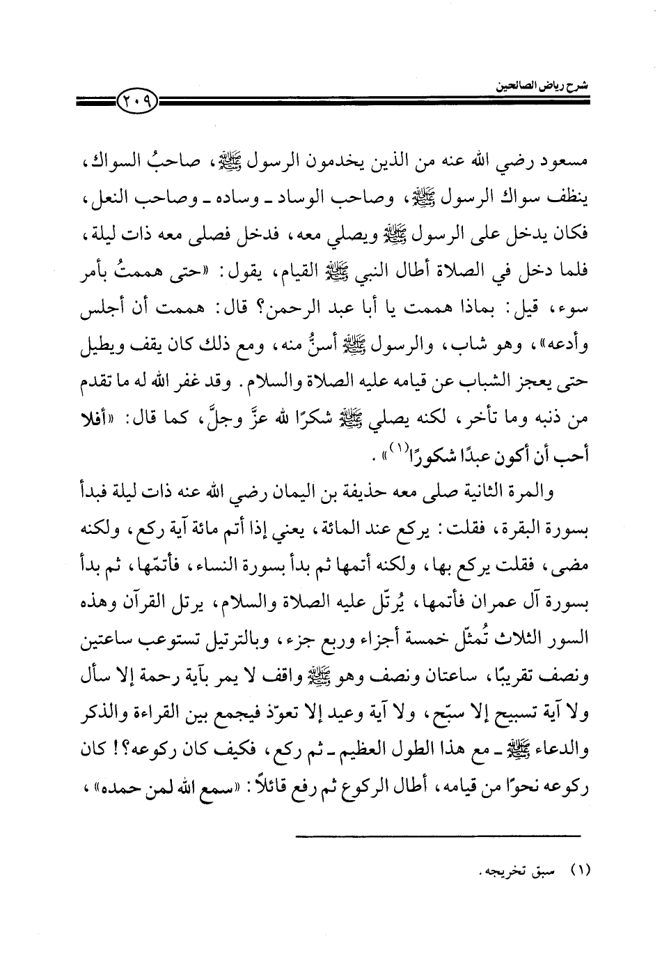 والمرة الثانية صلى معه حذيفة بن اليمان رضي الله عنه فبدأ بسورة البقرة، فقلت: يركع عند المائة، ولكنه مضى، فقلت: يركع بها، ولكنه أتمها ثم بدأ بسورة النساء، فأتمها، ثم بدأ بسورة آل عمران فأتمها، يرتل عليه الصلاة والسلام، يرتل القرآن، وهذه السور الثلاث تمثل خمسة أجزاء وربع.