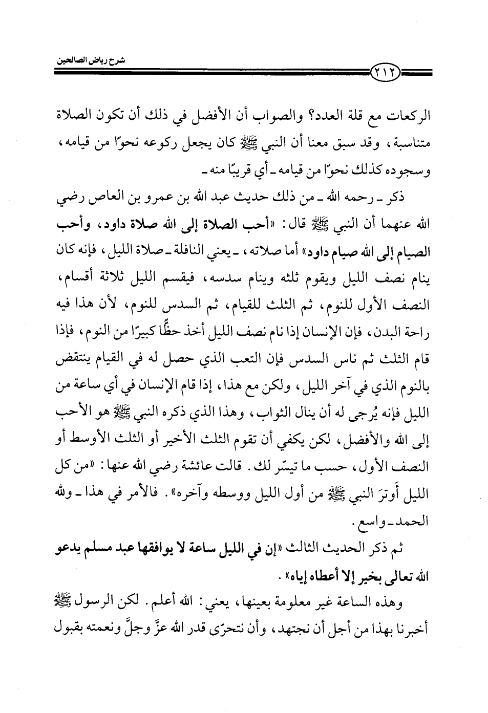 الركعات مع قلة العدد، والصواب أن الأفضل في ذلك أن تكون الصلاة متناسبة، وقد سبق معنا أن النبي صلى الله عليه وسلم كان يجعل ركوعه نحوا من قيامه، وسجوده نحوا من قيامه، أي قريبا منه، وذكر رحمه الله من ذلك حديث عبد الله بن عمرو بن العاص رضي الله عنهما، أن النبي صلى الله عليه وسلم قال: أحب الصلاة إلى الله صلاة داود، وأحب الصيام إلى الله صيام داود أما صلاته، يعني النافلة، صلاة الليل، فإنه كان ينام نصف الليل ويقوم ثلثه وينام سدسه، فيقسم الليل ثلاثة أقسام، النصف الأول للنوم، ثم الثلث للقيام، ثم السدس للنوم، لأن هذا فيه راحة البدن، فإن الإنسان إذا نام نصف الليل أخذ حظا كبيرا من النوم، فإذا قام الثلث ثم نام السدس فإن التعب الذي حصل له في القيام يذهب بالنوم الذي في آخر الليل، ولكن مع هذا، إذا قام الإنسان في أي ساعة من الليل فإنه يرجى له أن ينال الثواب، هذا الذي ذكره النبي صلى الله عليه وسلم هو الأحب إلى الله والأفضل، لكن يكفي أن تقوم الثلث الأخير أو الثلث الأوسط أو النصف الأول، حسب ما تيسر لك؟ قالت عائشة رضي الله عنها: من كل الليل أوتر النبي صلى الله عليه وسلم من أول الليل ووسطه وآخره.