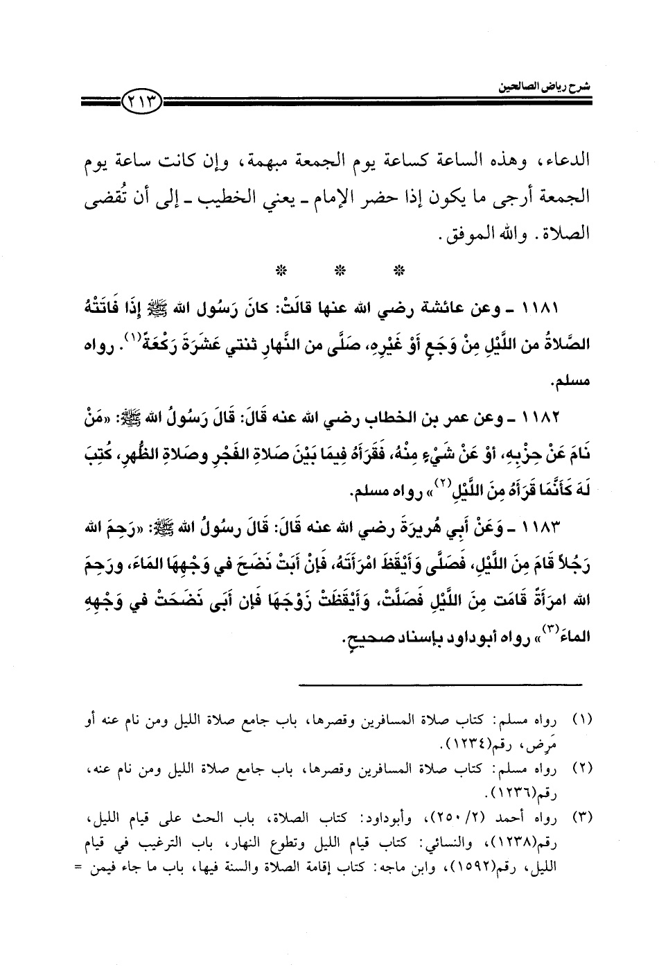 1182 - وعن عمر بن الخطاب رضي الله عنه قال: قال رسول الله صلى الله عليه وسلم: من نام عن حزبه، أو عن شيء منه، فقرأه فيما بين صلاة الفجر وصلاة الظهر، كتب له كأنما قرأه من الليل رواه مسلم.