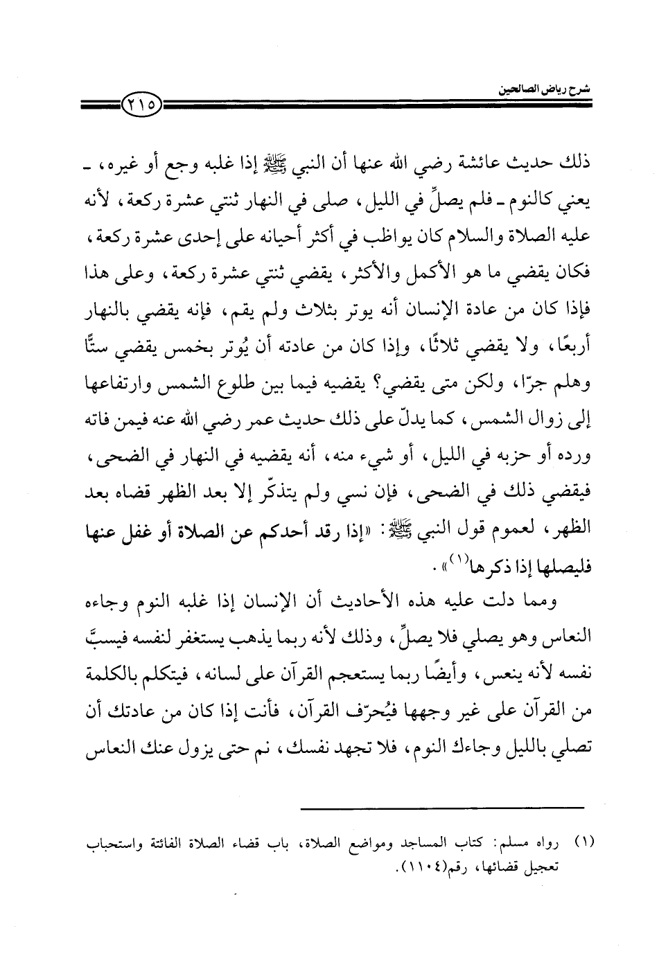 ومما دلت عليه هذه الأحاديث أن الإنسان إذا غلبه النوم وجاءه النعاس وهو يصلي فلا يصلي، وذلك لأنه ربما يذهب يستغفر لنفسه فيسب نفسه لأنه ينعس، وأيضا ربما يستعجم القرآن على لسانه، فيتكلم بالكلمة من القرآن على غير وجهها فيحرف القرآن، فأنت إذا كان من عادتك أن تصلي بالليل وجاءك النوم، فلا تجهد نفسك، نم حتى يزول عنك النعاس
