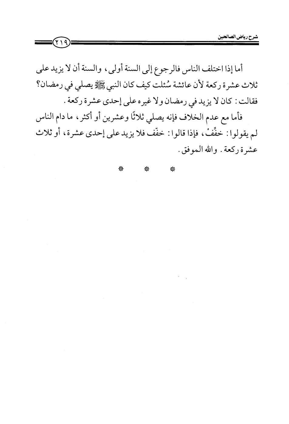 أما إذا اختلف الناس فالرجوع إلى السنة أولى، والسنة ألا يزيد على ثلاث عشرة ركعة لأن عائشة سئلت كيف كان النبي صلى الله عليه وسلم يصلي في رمضان؟ فقالت: كان لا يزيد في رمضان ولا غيره على إحدى عشرة ركعة.