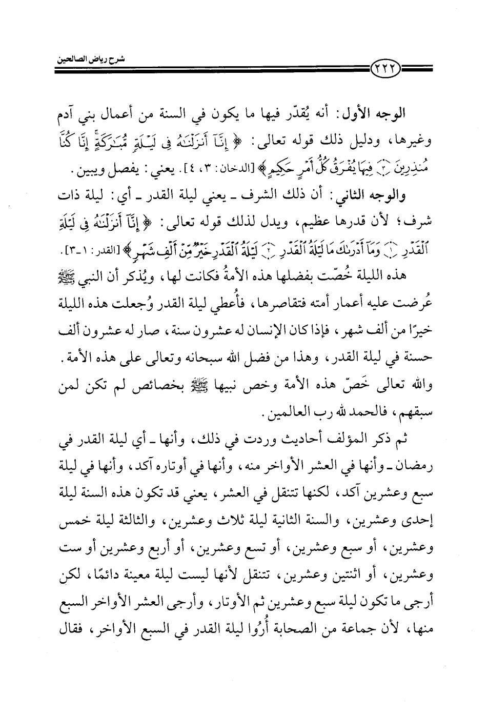 ثم ذكر المؤلف أحاديث وردت في ذلك، وأنها أي ليلة القدر في رمضان وأنها في العشر الأواخر منه، وأنها في أوتاره آكد، وأنها في ليلة سبع وعشرين آكد، لكن هي تنتقل في العشر يعني قد تكون هذه السنة ليلة إحدى وعشرين والسنة الثانية ليلة ثلاث وعشرين، والثالثة ليلة خمس وعشرين، أو سبع وعشرين، أو تسع وعشرين، أو أربع وعشرين أو ست وعشرين، أو اثنتين وعشرين، تنتقل لأنها ليست ليلة معينة دائما، لكن أرجى ما تكون ليلة سبع وعشرين ثم الأوتار، وأرجى العشر الأواخر السبع الأواخر منها، لأن جماعة من الصحابة أروا ليلة القدر في السبع الأواخر، فقال