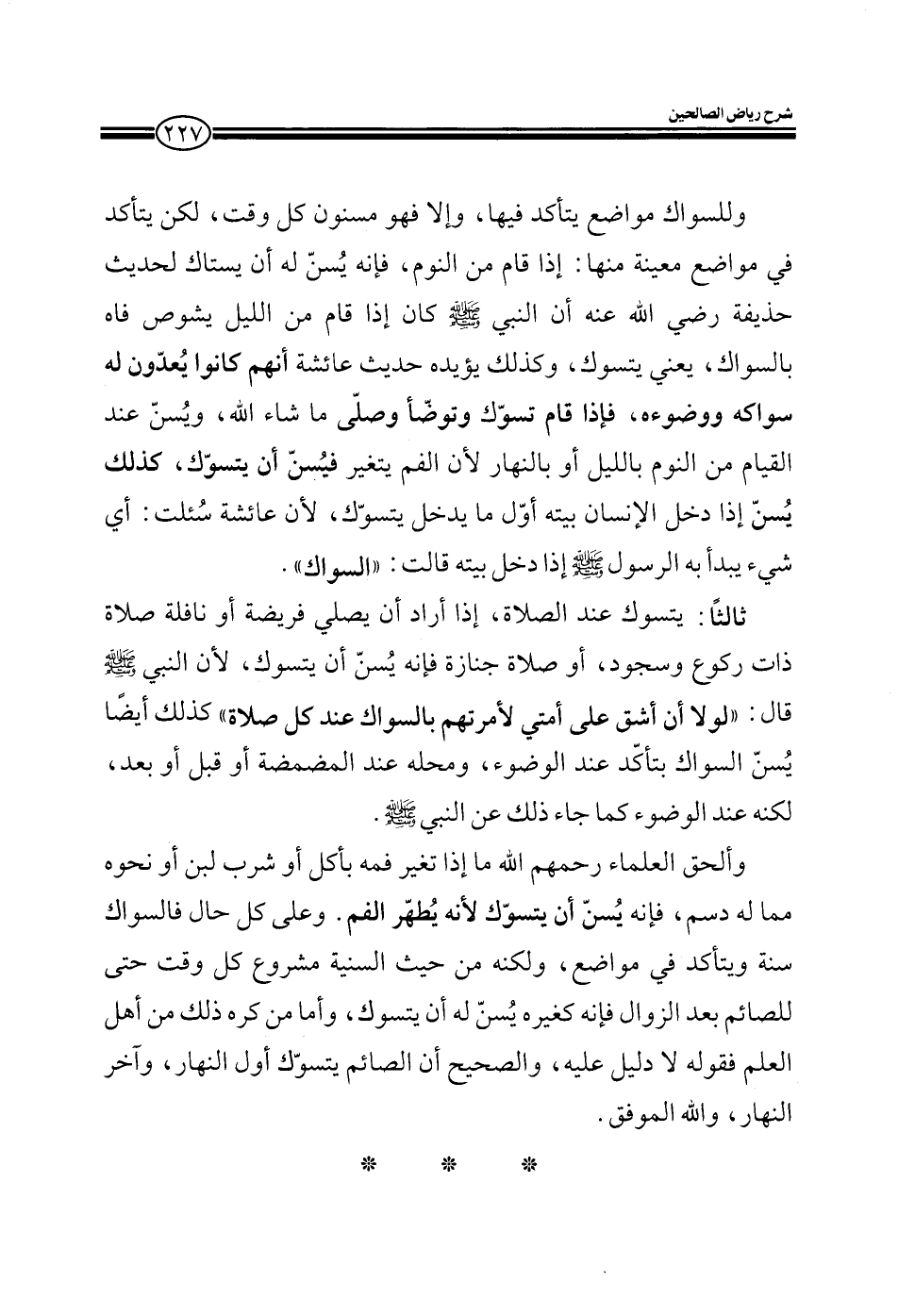 ثالثا: يتسوك عند الصلاة ذهب ليصلي فريضة أو نافلة صلاة ذات ركوع أو سجود أو صلاة جنازة فإنه يسن أن يتسوك لأن النبي صلى الله عليه وسلم قال: لولا أن أشق على أمتي لأمرتهم بالسواك عند كل صلاة يسن السواك أيضا بتأكد عند الوضوء ومحله عند المضمضة أو قبل أو بعد لكنه عند الوضوء كما جاء ذلك عن النبي صلى الله عليه وسلم.