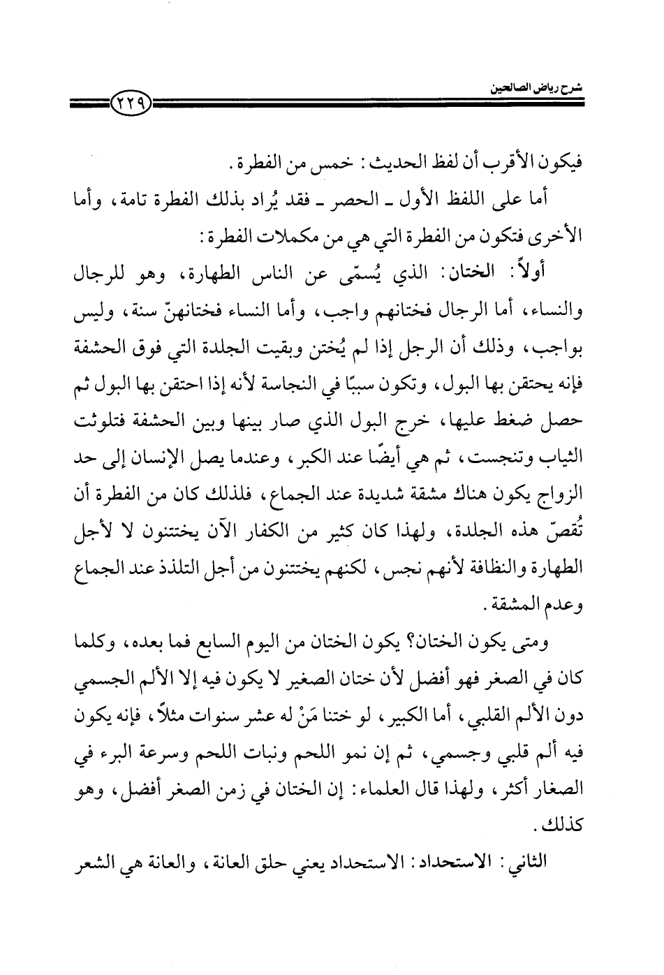 أولا: الختان: الذي يسمى عند الناس الطهارة وهو للرجال والنساء، أما الرجال فختانهم واجب، وأما النساء فختانهن سنة وليس بواجب وذلك أن الرجل إذا لم يختن وبقيت الجلدة التي فوق الحشفة فإنه يحتقن بها البول وتكون سببا في النجاسة لأنه إذا احتقن بها البول ثم حصل ضغط عليها خرج البول الذي صار بينها وبين الحشفة فتلوثت الثياب وتنجست ثم هي أيضا عند الكبر وعندما يصل الإنسان إلى حد الزواج يكون هناك مشقة شديدة عند الجماع فلذلك كان من الفطرة أن تقص هذه الجلدة ولهذا كان كثير من الكفار الآن يختتنون لا لأجل الطهارة والنظافة لأنهم نجس لكنهم يختتنون من أجل التلذذ عند الجماع وعدم المشقة هذه واحدة.