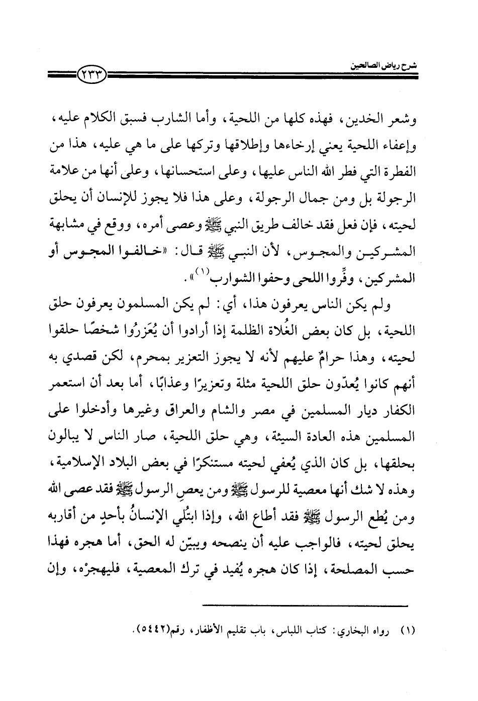 وشعر الخدين فهذه كلها من اللحية وأما الشارب فقد سبق الكلام عليه وإعفاء اللحية يعني إرخاءها وإطلاقها وتركها على ما هي عليه هذا من الفطرة التي فطر الله الناس عليها وعلى استحسانها وعلى أنها من علامة الرجولة بل ومن جمال الرجولة، وعلى هذا فلا يجوز للإنسان أن يحلق لحيته فإن فعل فقد خالف طريق النبي صلى الله عليه وسلم وعصى أمره ووقع في مشابهة المشركين والمجوس لأن النبي صلى الله عليه وسلم قال: خالفوا المجوس أو المشركين وفروا اللحى وحفوا الشوارب ولم يكن الناس يعرفون هذا يعني لم يكن المسلمون يعرفون حلق اللحية بل كان بعض الغلاة الظلمة إذا أرادوا أن يعزروا شخصا حلقوا لحيته وهذا حرام عليهم لأنه لا يجوز التعزير بمحرم لكن يقاس به أنهم كانوا يعدون حلق اللحية مثلة وتعزيرا وعذابا أما بعد أن استعمر الكفار ديار المسلمين في مصر والشام والعراق وغيرها وأدخلوا على المسلمين هذه العادة السيئة وهي حلق اللحية صار الناس لا يبالون بحلقها بل كان الذي يعفي لحيته مستنكرا من بعض البلاد الإسلامية وهذه لا شك أنها معصية للرسول صلى الله عليه وسلم ومن يعص الرسول صلى الله عليه وسلم فقد عصى الله ومن يطع الرسول صلى الله عليه وسلم فقد أطاع الله وإذا ابتلى الإنسان بأحد من أقاربه يحلق لحيته فالواجب عليه أن ينصحه ويبين له الحق أما هجره فهذا حسب المصلحة إذا كان هجره يفيد في ترك المعصية فليهجره وإن