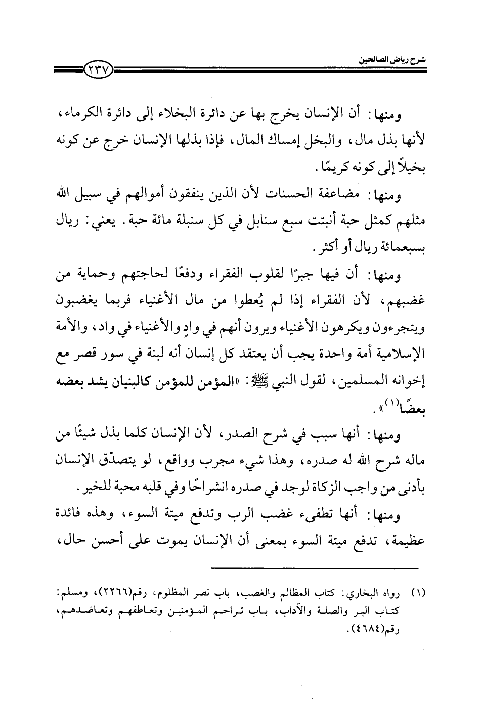 ومنها أن الإنسان يخرج بها عن دارة البخلاء إلى دائرة الكرماء لأنها بذل مال والبخل إمساك المال فإذا بذلها الإنسان خرج من كونه بخيلا إلى كونه كريما ومنها مضاعفة الحسنات لأن الذين ينفقون أموالهم في سبيل الله مثلهم كمثل حبة أنبتت سبع سنابل في كل سنبلة مائة حبة يعني: ريال بمائة ريال أو أكثر ومنها أن فيها جبرا لقلوب الفقراء ودفعا لحاجتهم وحماية من غضبهم لأن الفقراء إذا لم يعطوا من مال الأغنياء ربما يغضبون ويتجرءون ويكرهون الأغنياء ويرون أنهم في واد والأغنياء في واد والأمة الإسلامية أمة واحدة يجب أن يعتقد كل إنسان أنه لبنة في سور قصر مع إخوانه المسلمين لقول النبي صلى الله عليه وسلم: المؤمن للمؤمن كالبنيان يشد بعضه بعضا ومنها أنها سبب في شرح الصدر لأن الإنسان كلما بذل شيئا من ماله شرح الله له صدره وهذا شيء مجرب وواقع لو يتصدق الإنسان بأدنى من واجب الزكاة لوجد في صدره انشراحا وفي قلبه محبة للخير ومنها أنها تطفئ غضب الرب وتدفع ميتة السوء وهذه فائدة عظيمة تدفع ميتة السوء يعني الإنسان يموت على أحسن حال