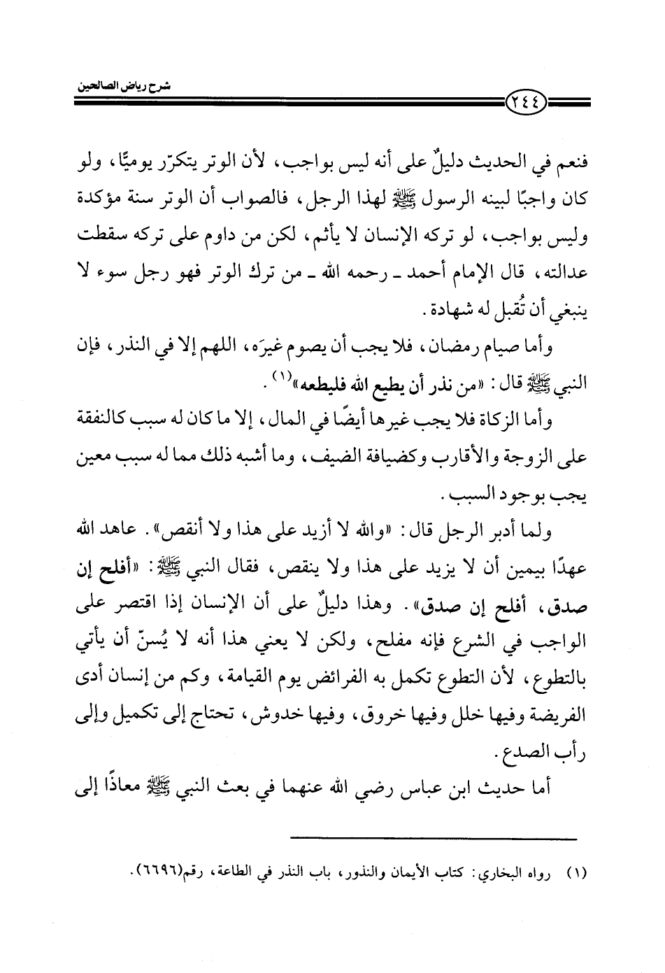 وأما قول الرجل لما أدبر والله لا أزيد على هذا ولا أنقص عاهد الله عهدا بيمين ألا يزيد على هذا ولا ينقص فقال النبي صلى الله عليه وسلم: أفلح إن صدق، أفلح إن صدق وهذا دليل على أن الإنسان إذا اقتصر على الواجب في الشرع فإنه مفلح ولكن لا يعني هذا أنه لا يسن أن يأتي بالتطوع لأن التطوع تكمل به الفرائض يوم القيامة وكم من إنسان أدى الفريضة وفيها خلل وفيها خروق وفيها خدوش تحتاج إلى تكميل وإلى رتق الصدع.