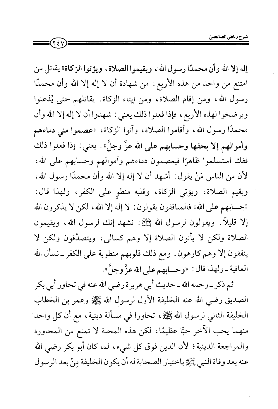 ثم ذكر رحمه الله حديث أبي هريرة رضي الله عنه في تحاور أبي بكر الصديق رضي الله عنه الخليفة الأول لرسول الله صلى الله عليه وسلم وعمر بن الخطاب الخليفة الثاني لرسول الله صلى الله عليه وسلم في مسألة دينية مع أن كل واحد منهما يحب الآخر حبا عظيما لكن هذه المحبة لا تمنع من المحاورة والمراجعة الدينية لأن الدين فوق كل شيء لما كان أبو بكر رضي الله عنه بعد وفاة النبي صلى الله عليه وسلم باختيار الصحابة له أن يكون الخليفة بعد الرسول