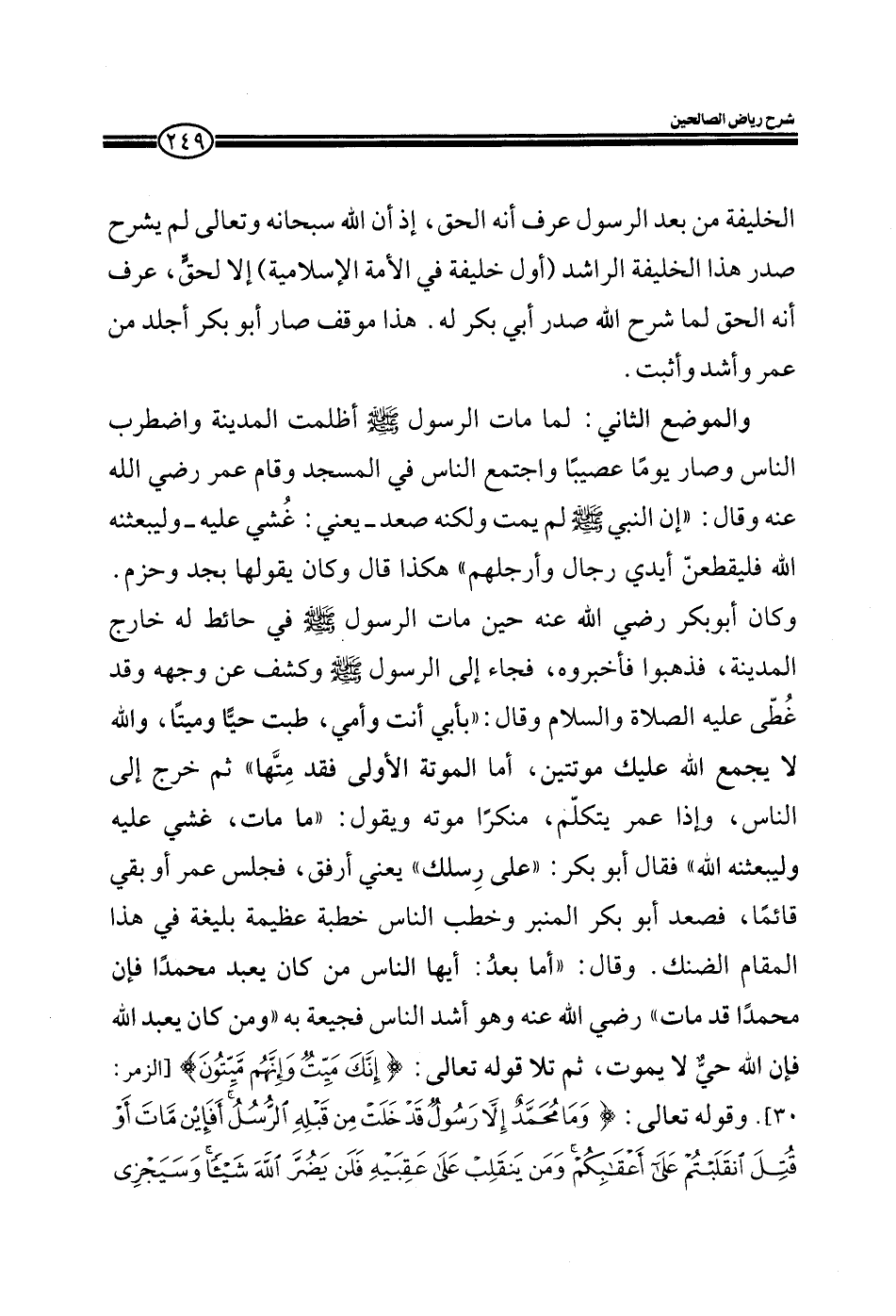 والموضع الثاني: لما مات الرسول صلى الله عليه وسلم أظلمت المدينة واضطرب الناس وصار يوما عظيما واجتمع الناس في المسجد وقام عمر وقال: إن النبي صلى الله عليه وسلم لم يمت ولكنه صعد يعني غشي عليه وليبعثنه الله فليقطعن أيدي رجال وأرجلهم اهتز قلبه يقولها بجد وحزم وكان أبو بكر رضي الله عنه حين مات الرسول صلى الله عليه وسلم خارج المدينة في حائط له فذهبوا فأخبروه أخبروا أبا بكر فجاء إلى الرسول صلى الله عليه وسلم وكشف عن وجهه وقد غطي عليه الصلاة والسلام كشف عن وجهه وقبله وقال: بأبي أنت وأمي طبت حيا وميتا والله لا يجمع الله عليك موتتين أما الموتة الأولى فقد متها ثم خرج إلى الناس وإذا عمر يتكلم ينكر ويقول: (ما مات غشي عليه وليبعثنه الله) فقال أبو بكر: (على رسلك) يعني أرفق فجلس عمر أو بقي قائما فصعد أبو بكر المنبر وخطب الناس خطبة عظيمة بليغة في هذا المقام الضنك قال: (أما بعد أيها الناس من كان يعبد محمدا فإن محمدا قد مات رضي الله عنه وهو أشد الناس فجيعة به ومن كان يعبد الله فإن الله حي لا يموت ثم تلا قوله تعالى: {إنك ميت وإنهم ميتون} وقوله تعالى: {وما محمد إلا رسول قد خلت من قبله الرسل أفإن مات أو قتل انقلبتم على أعقابكم ومن ينقلب على عقبيه فلن يضر الله شيئا}