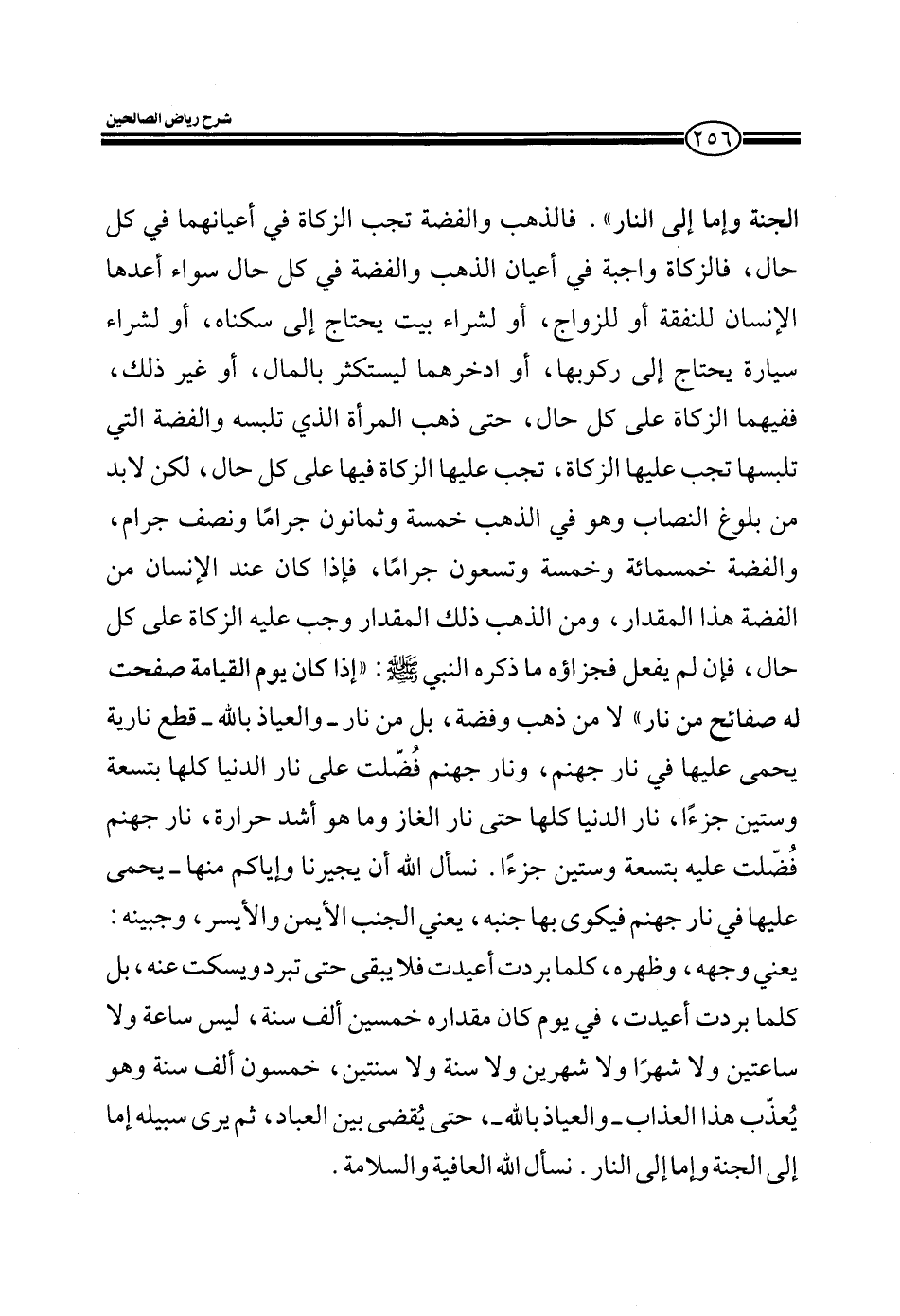 الجنة وإما إلى النار فالذهب والفضة تجب الزكاة في أعيانهما في كل حال، فالزكاة واجبة في أعيان الذهب والفضة في كل حال سواء أعدها الإنسان للنفقة أو للزواج أو لشراء بيت يحتاج إلى سكناه أو شراء سيارة يحتاج إلى ركوبها أو ادخرهما ليستكثر بهما المال أو غير ذلك ففيهما الزكاة تجب على كل حال حتى ذهب المرأة الذي تلبسه والفضة التي تلبسها تجب عليها الزكاة تجب الزكاة فيها على كل حال لكن لابد من بلوغ النصاب وهو في الذهب خمسة وثمانون جراما ونصف جرام، والفضة خمسمائة وخمسة وتسعون جراما، فإذا كان عند الإنسان من الفضة هذا المقدار ومن الذهب ذلك المقدار وجب عليه الزكاة على كل حال فإن لم يفعل فجزاؤه ما ذكره النبي صلى الله عليه وسلم: إذا كان يوم القيامة صفحت له صفائح من نار لا من ذهب وفضة، من نار والعياذ بالله قطع نارية ويحمي عليها في نار جهنم ونار جهنم فضلت على نار الدنيا كلها بتسعة وستين جزءا نار الدنيا كلها حتى نار الغاز وما هو أشد حرارة نار جهنم فضلت عليها بتسعة وستين جزءا نسأل الله أن يجيرنا وإياكم منها يحمى عليها في نار جهنم فيكوى به جنبه يعني الجنب الأيمن والأيسر وجبينه يعني وجهه وظهره واضح معناه كلما بردت أعيدت لا تبقى حتى تبرد وتسكت عنه، كلما بردت أعيدت في يوم كان مقداره خمسين ألف سنة، ليس ساعة ولا ساعتين ولا شهرا ولا شهرين ولا سنة ولا سنتين خمسون ألف سنة وهو يعذب هذا العذاب والعياذ بالله حتى يقضى بين العباد ثم يرى سبيله إما إلى الجنة وإما إلى النار نسأل الله العافية.