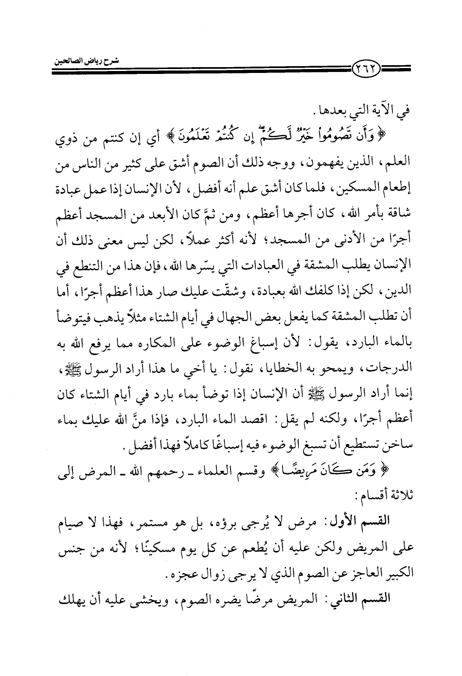 {فمن كان منكم مريضا} والمرض ثلاثة أقسام: 1 - قسم مرضي لا يرجى برؤه بل هو مستمر فهذا لا صيام على المريض ولكن عليه أن يطعم عن كل يوم مسكينا لأنه من جنس الكبير العاجز عن الصوم الذي لا يرجى زوال عجزه.