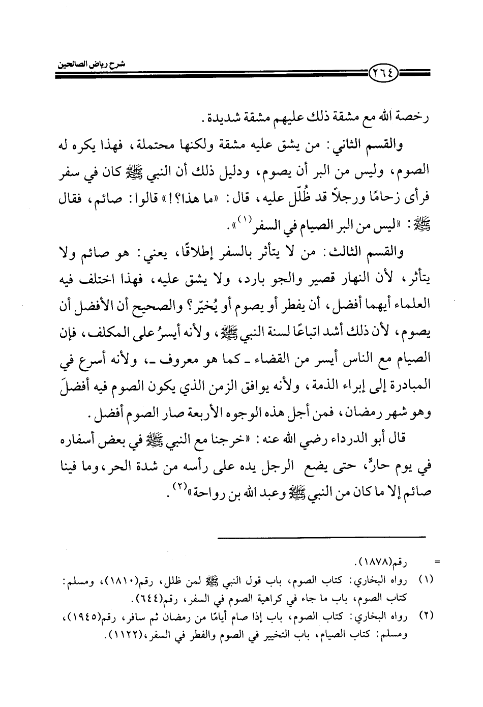 والقسم الثالث: من لا يتأثر بالسفر إطلاقا يعني صائم ولا يتأثر لأن النهار قصير والجو بارد ولا يهمه فهذا اختلف فيه العلماء أيهما أفضل يفطر أو يصوم أو يخير والصحيح أن الأفضل أن يصوم لأن ذلك أشد اتباعا لسنة النبي صلى الله عليه وسلم ولأنه أيسر على المكلف فإن الصيام مع الناس أيسر من القضاء ولأنه أسرع في المبادرة في إبراء الذمة ولأنه يوافق الزمن الذي يكون فيه الصوم أفضل وهو شهر رمضان فمن أجل هذه الأربعة كان الصوم أفضل.