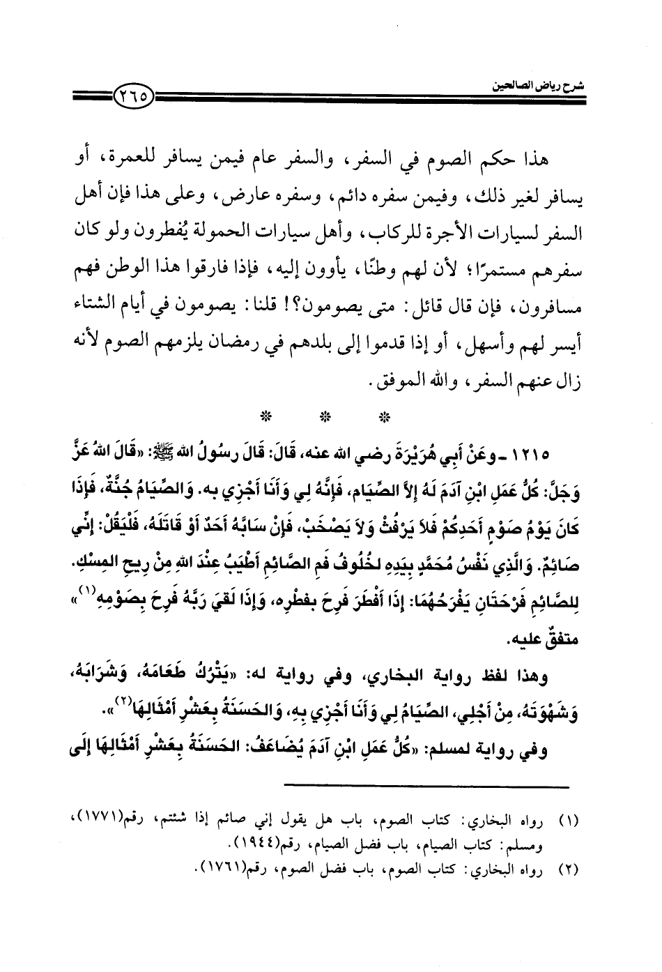 1215 - وعن أبي هريرة رضي الله عنه قال: قال رسول الله صلى الله عليه وسلم: قال الله عز وجل: كل عمل ابن آدم له إلا الصيام فإنه لي وأنا أجزي به والصيام جنة فإذا كان يوم صوم أحدكم فلا يرفث ولا يصخب فإن سابه أحد أو قاتله فليقل إني صائم والذي نفس محمد بيده لخلوف فم الصائم أطيب عند الله من ريح المسك للصائم فرحتان يفرحهما إذا أفطر فرح بفطره وإذا لقي ربه فرح بصومه متفق عليه.